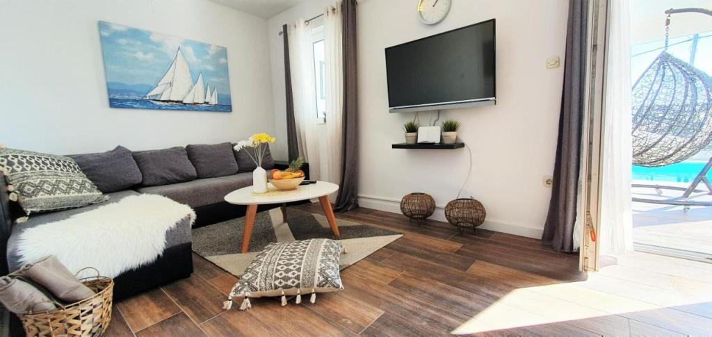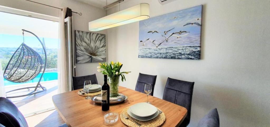 Kuća za odmor Ana Laguna nalazi se na otoku Drveniku Malom kraj Trogira i nudi klimatizirani smještaj s privatnim bazenom. Nalazi se 200 metara od plaže Vela Rina. Kuća ima 3 spavaće sobe, 2 kupaonice, posteljinu, ručnike, TV ravnog ekrana s kabelskim programima, blagovaonicu, potpuno opremljenu kuhinju i balkon s pogledom na bazen. Gosti mogu uživati ​​u obroku u blagovaonici na otvorenom s pogledom na vrt.