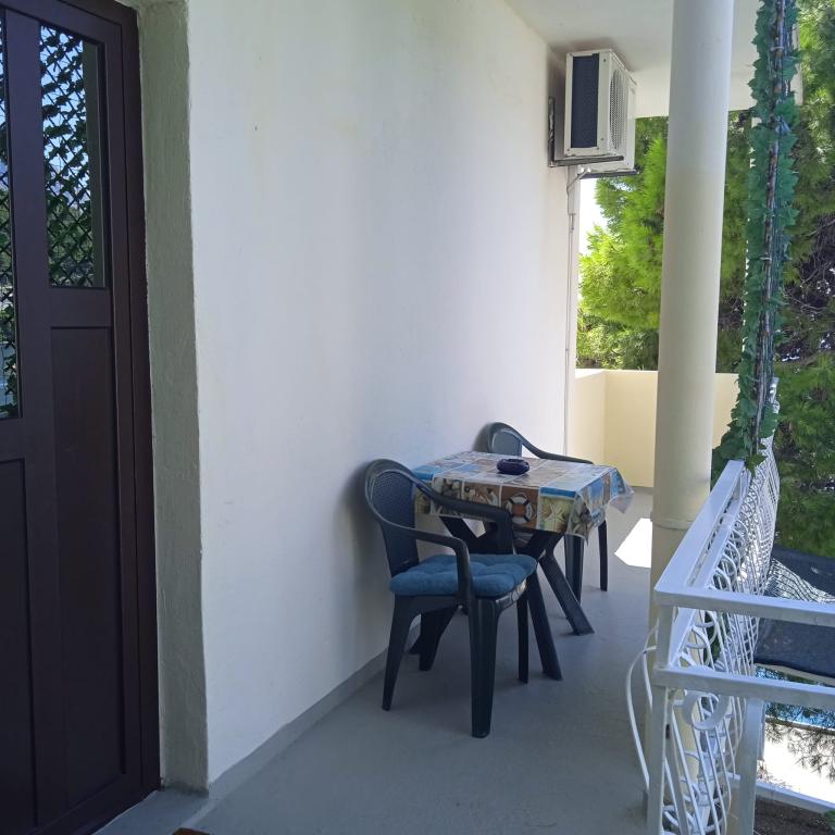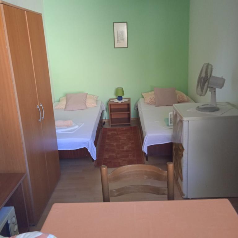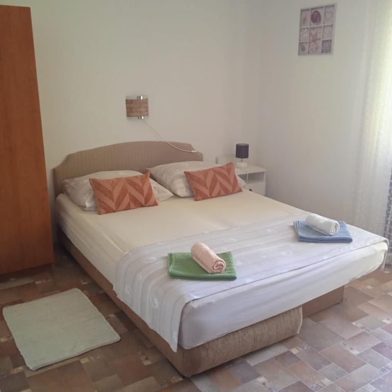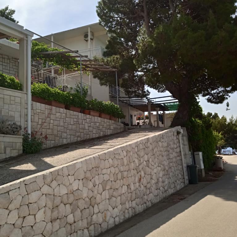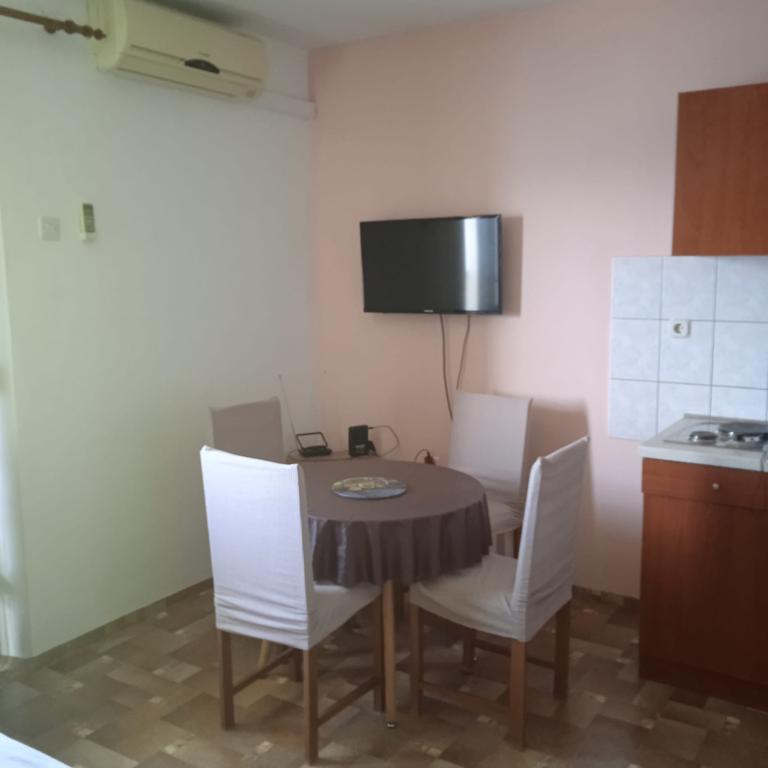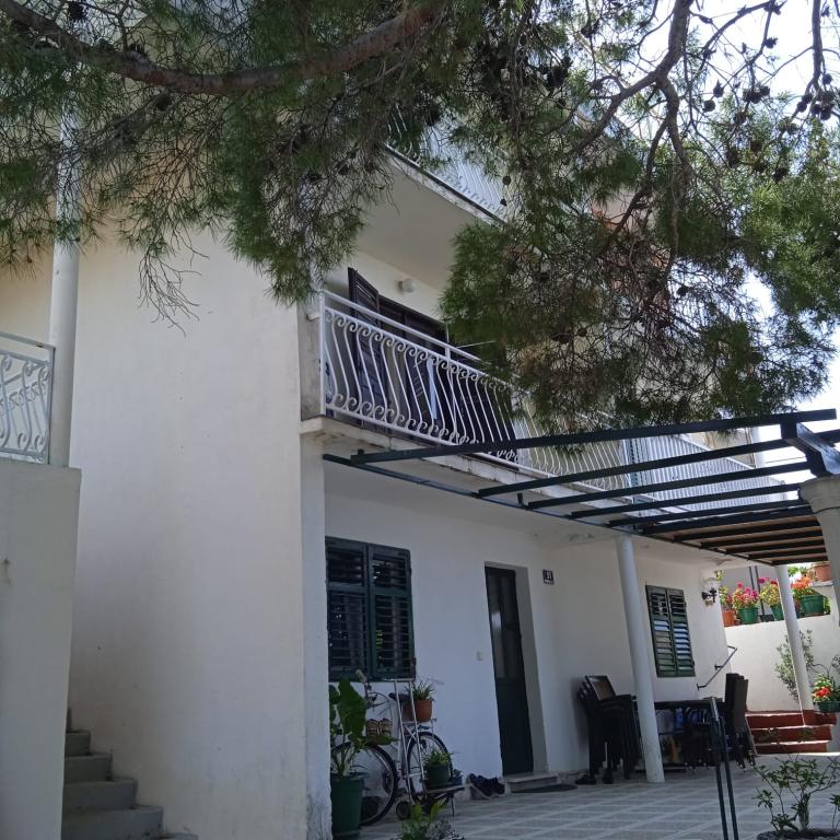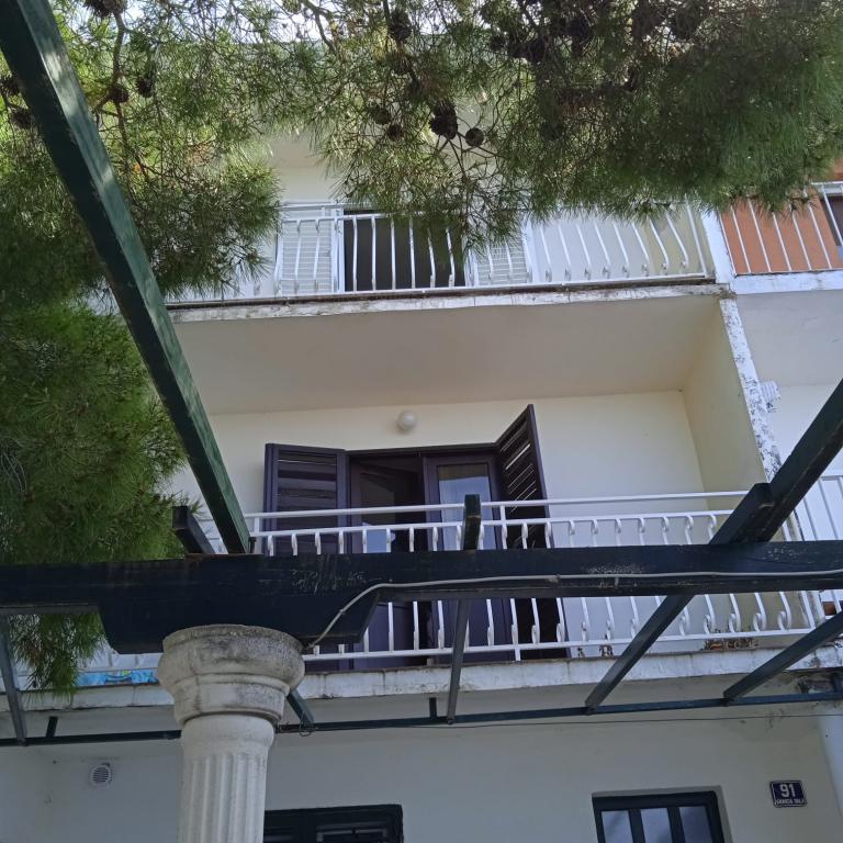 Obiteljski apartman(2+2) za četiri osobe nalazi se u kući koja je prvi red do mora. Apartman je na drugom katu i ima poseban ulaz, što osigurava privatnost. Pogled na more je sa balkona i terase, kojom se ulazi u apartman. Parking je uz cestu ispred kuće u kojoj se nalazi apartman. (Uključen je u cijenu smještaja.) Apartman se sastoji od dvije odvojene sobe i kupaonice. Kuhinjski dio nalazi se su sklopu veće sobe(sa balkonom) i opremljena je posuđem i ostalim kuhinjskim priborom. Hladnjak se također nalazi i u drugoj sobi. Apartman je opremljen klimom i TV-om. Wi-Fi je dostupan. Nema dodatnih troškova. Apartman je prikladan za obitelj sa dvoje djece ili dva para.