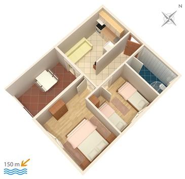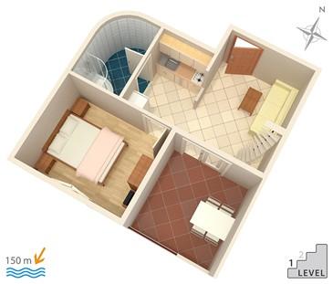 Kuća u mirnoj (slijepoj) ulici bez prometa. Od plaže smo udaljeni 150m. Plaža je pješčana, sa velikim plićakom, idealna za djecu. Do centra Omiša vam treba 15-ak minuta hoda, a Split je udaljen 25km.