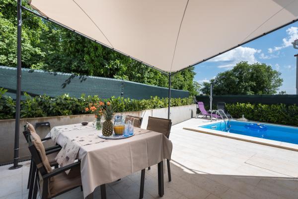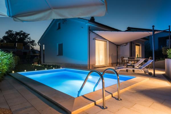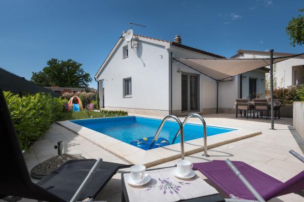 CASA DELPHIA je moderna samostojeća prizemnica s grijanim bazenom veličine 5 x 3 metara, u mjestu Šegotići, u Općini Marčana. Smještena je na tihoj i mirnoj lokaciji pa je idealan izbor za potpuni odmor od buke i gradske gužve. Casa Delphia namijenjena je za 4 osobe, smještena je na parceli veličine 315 m2, a ima 72 m2 stambene površine koju čine: kuhinja, blagovaona i dnevni boravak povezani u jednoj prostoriji, dvije spavaće sobe i kupaonica te odvojeni prostor s perilicom za rublje. Kuća je u potpunosti klimatizirana. Iz dnevnog boravka izlazi se na terasu na kojoj možete uživati u jutarnjoj kavi, na roštilju pripremiti ukusan ručak te navečer uz osvijetljeni bazen popiti koktel. Očekuju vas udobne ležaljke, stol i stolice te solarni tuš uz bazen. Želite li začiniti vaše ukusne obroke, poslužite se začinskim biljem iz malenog mediteranskog vrta. Pred ulazom u kuću nalazi se parkiralište za auto, bicikle ili skutere. Parcela je potpuno ograđena i zatvorena.