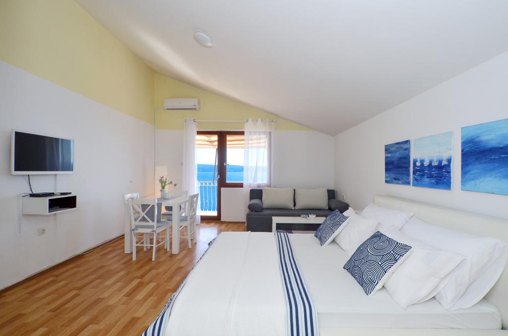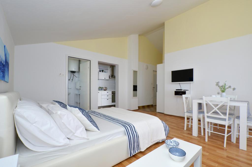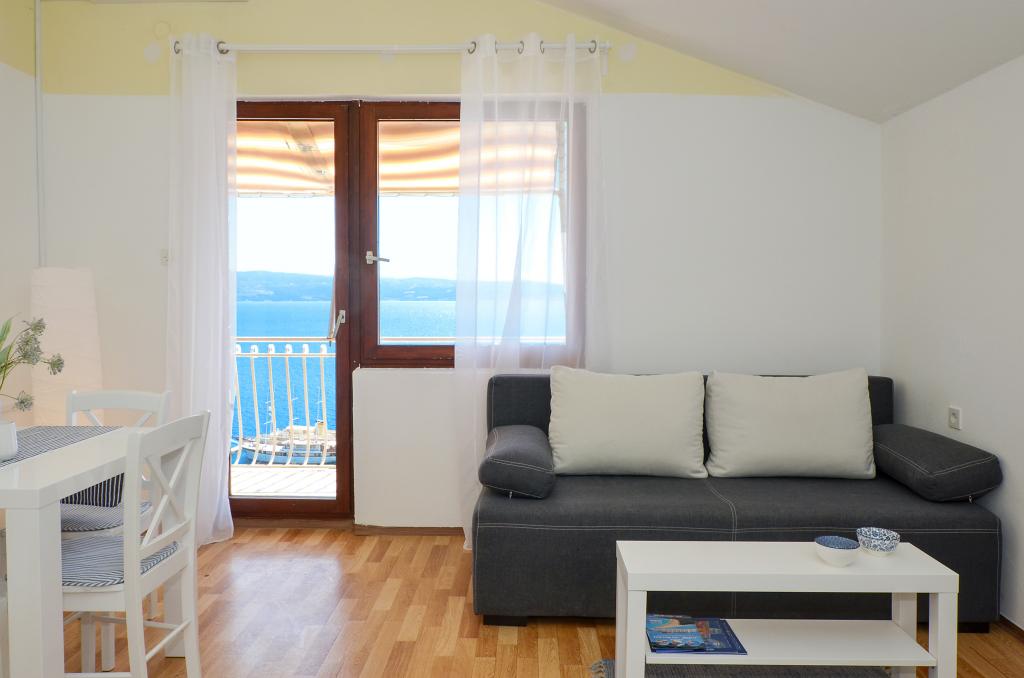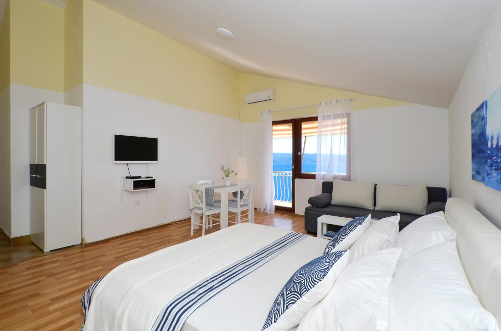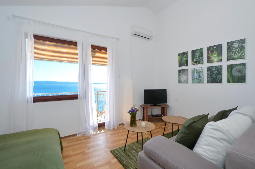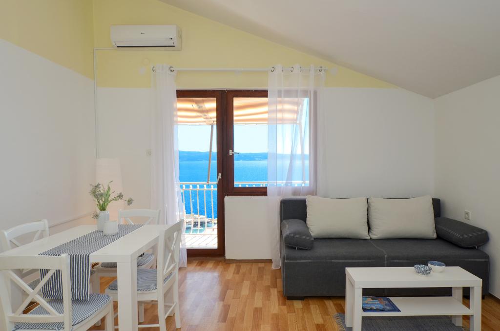 Apartamni se nalaze u obiteljskoj kući na drugom i trećem katu sa posebnim ulazom. Apartman 6+0 prostire se na drugom katu kuće. Luksuzno je opremljen sa svim što vam je potrebno za kvalitetan odmor. Dva studio apartmana i jedan dvosobni apartman nalaze se u potkrovlju, te su idealni za manje obitelji ili veće društvo korištenjem cijelog kata. Poptuno opremljeni apartmani nalaze se 150 m od mora i šljunčane plaže, te 300 m od jedne od najljepših plaža između Splita i Omiša.