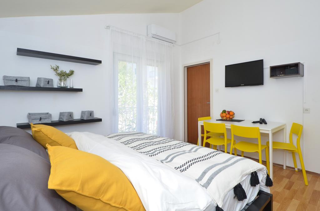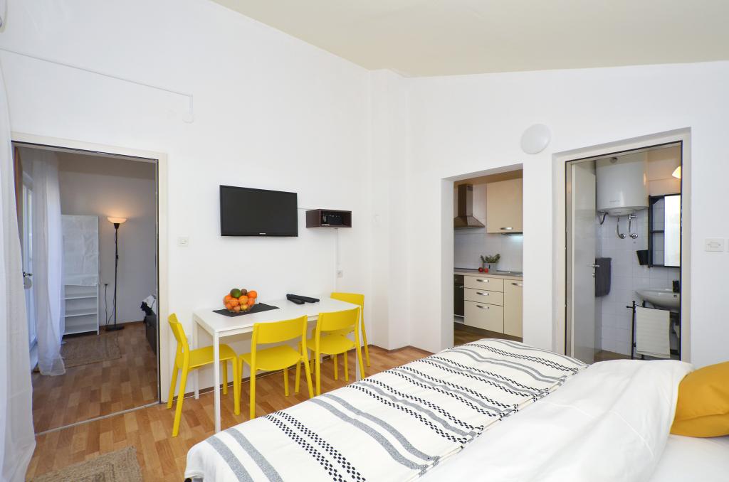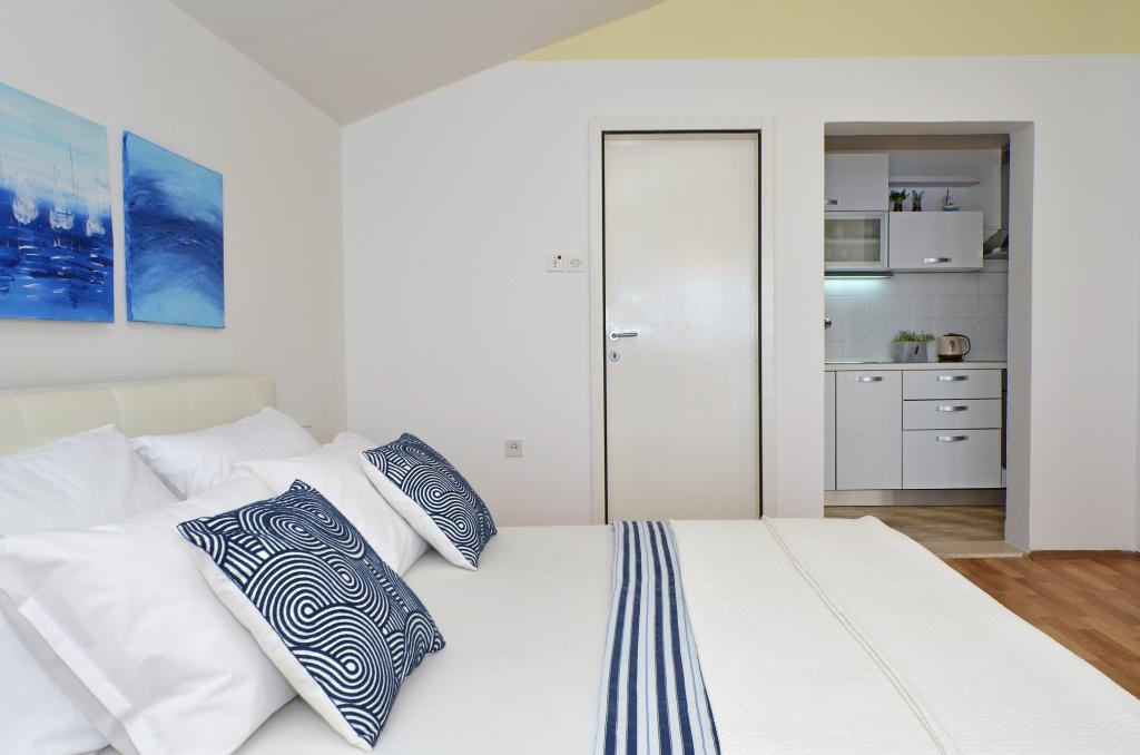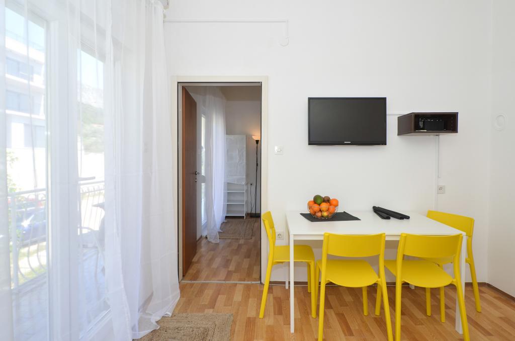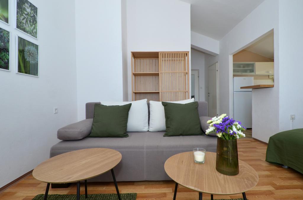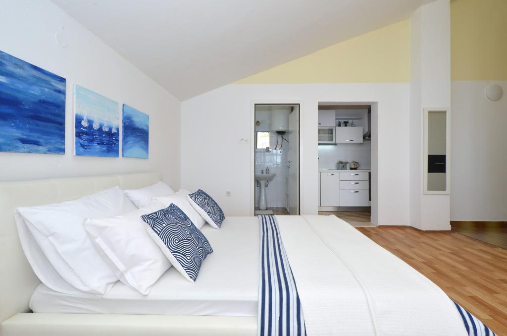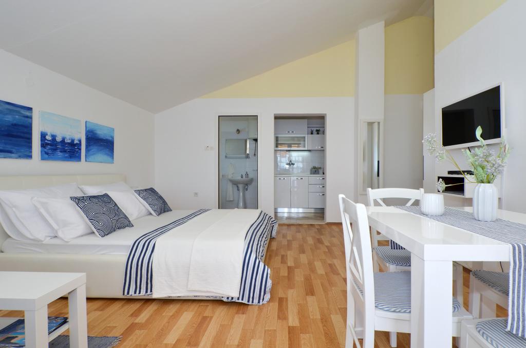 Apartamni se nalaze u obiteljskoj kući na drugom i trećem katu sa posebnim ulazom. Apartman 6+0 prostire se na drugom katu kuće. Luksuzno je opremljen sa svim što vam je potrebno za kvalitetan odmor. Dva studio apartmana i jedan dvosobni apartman nalaze se u potkrovlju, te su idealni za manje obitelji ili veće društvo korištenjem cijelog kata. Poptuno opremljeni apartmani nalaze se 150 m od mora i šljunčane plaže, te 300 m od jedne od najljepših plaža između Splita i Omiša.