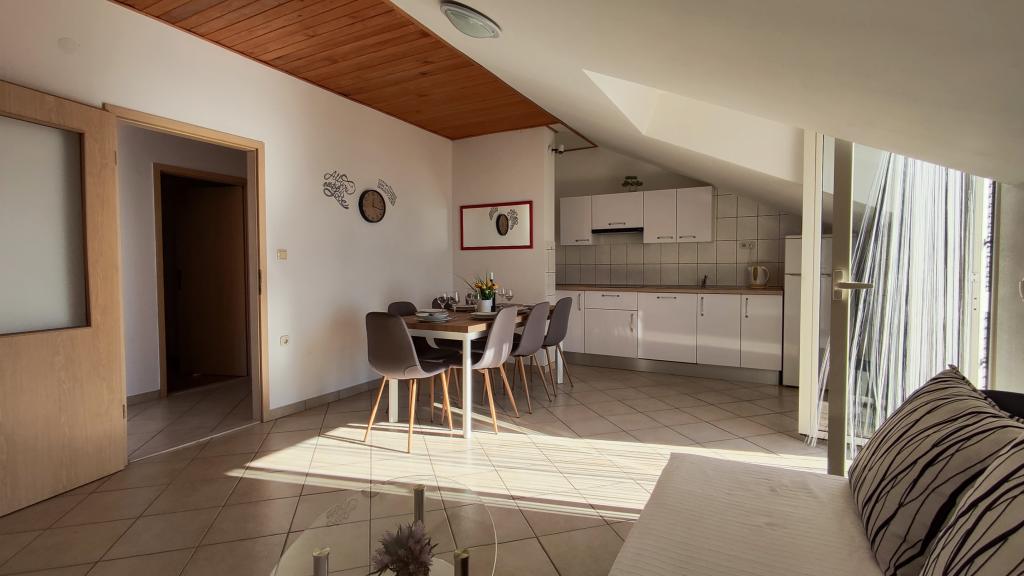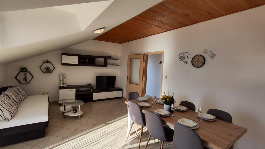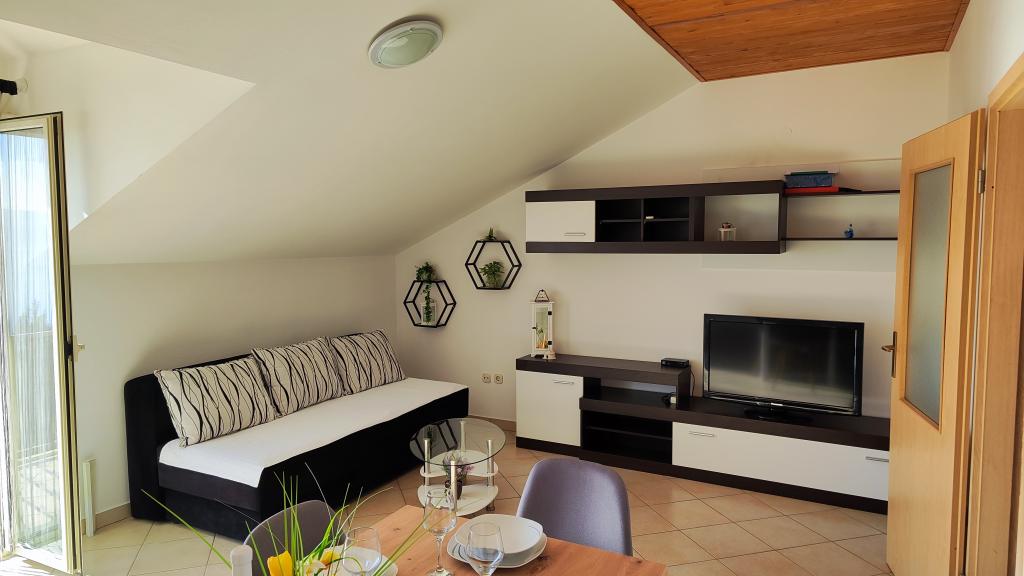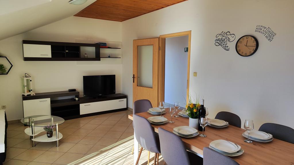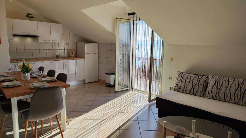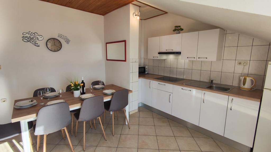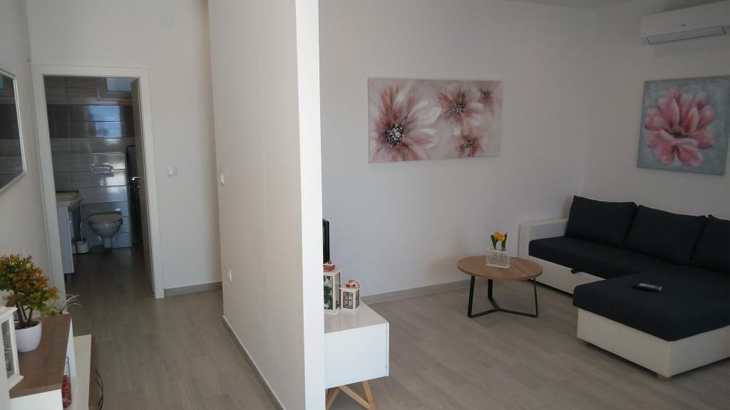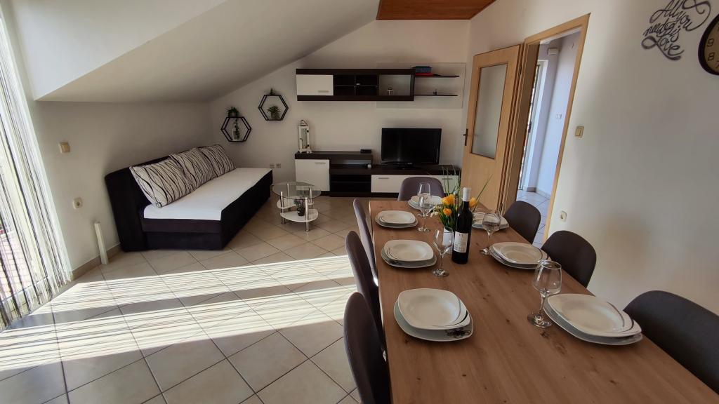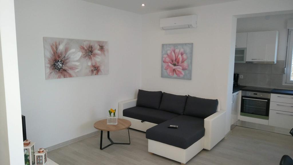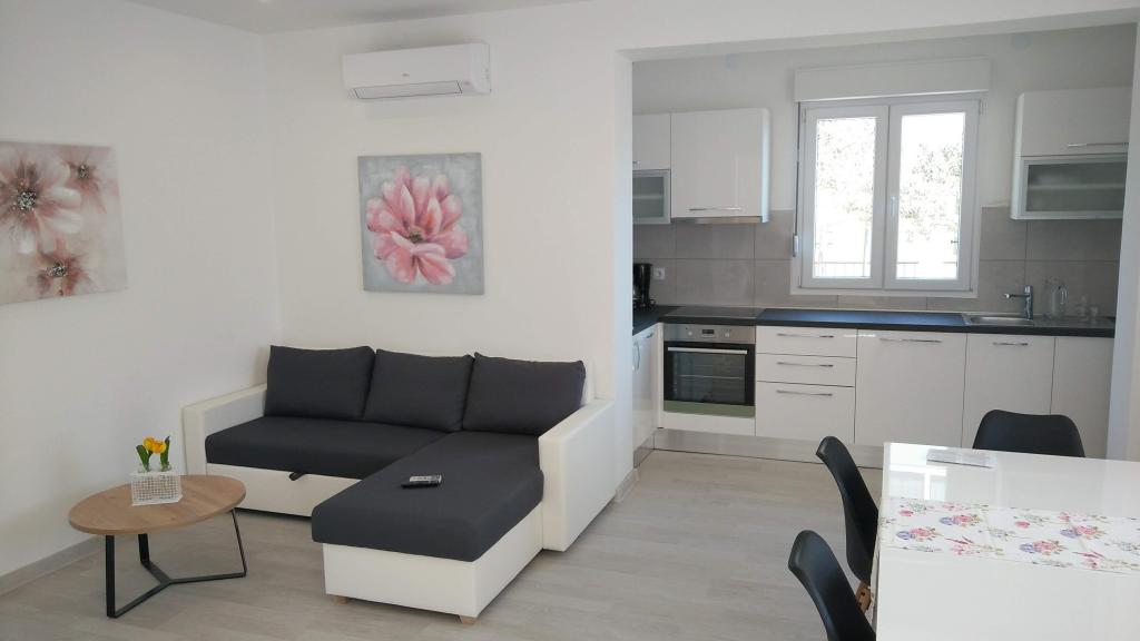 Boravili smo u apartmanu A2+2 OD 08, -15,08,2024. Lijep, uredan i čist. Identičan kao u oglasu. Moderno uređen. Ispred apartmana velika terasa koja ima hlad tokom cijelog dana. Prekrasan mali travnjak,zelenilo sa cvijećem i palmom, baš lijepo izgleda. Naravno i pogled na more.Domaćini su jako ljubazni i simpatični. Dostupni ako vam nešto treba a ipak nenametljivi. Plaža je lijepa i čista, ima i sunca i hlada. Može birati tko šta voli. Nama je jedino trebalo vremena da se priviknemo na pješačenje uz brijeg po povratku s plaže, ali postoje prečice pa smo i to svladali, Lokacija je super, može se do Splita i Omiša za 15-20min. Autobusom ili autom. Preporuka za restoran Terapija na plaži.