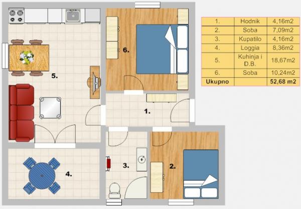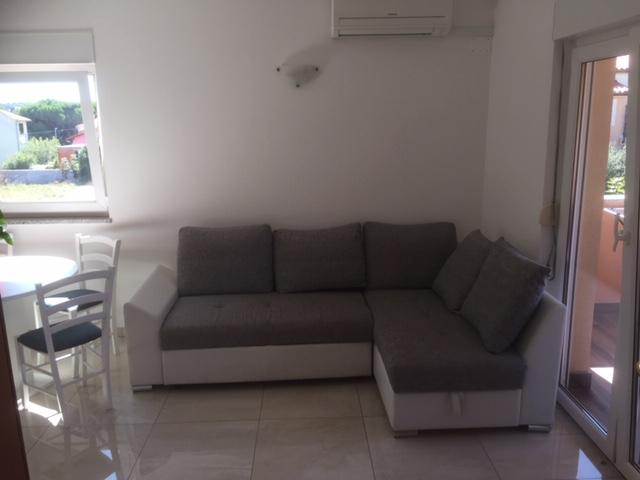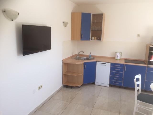Suvremeno opremljeni novi komforni apartmani 55m2, dnevni boravak, blagovaonica, kuhinja, spavaća soba, dječija soba, kupatilo, terasa, klima, wi-fi, perilica suđa, tv, novo...5 minuta hoda do prekrasne plaže, 4 minute do trgovine...