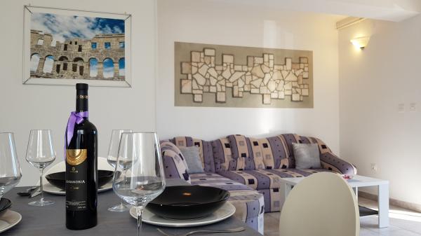 Apartman sa bazenom se nalazi u mirnoj ulici, ali nedaleko o prelepe plaze sa pogledom na Brione i kampa sa igralistem za decu. Deset minuta lagane šetnje i naćićete se u centru Fažane, živopisnom gradiću odakle imate svakodnevnu priliku za izlet na Brione. Ukoliko dolazite autom imate mogućnost da obiđete celu istarsku rivijeru i prelepe gradove Pulu, Rovinj i Poreč. Nikako ne zaboravite da svratite i u zelenu Istru. Divni domaćini Dorijanu i Meri će vam se naći u svakoj prilici i uputiti na aktivne sadržaje koji se nude u tom trenutku vašeg boravka. Apartmani imaju novoizgrađeni bazen izuzetne lepote i čistoće uz koji se možete odmarati u smokvinom hladu.
