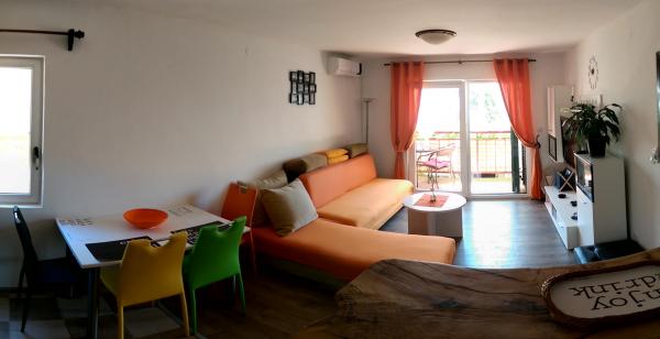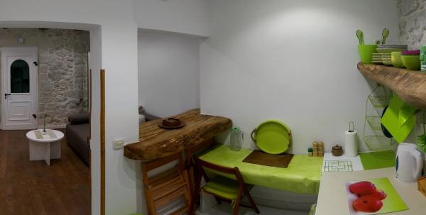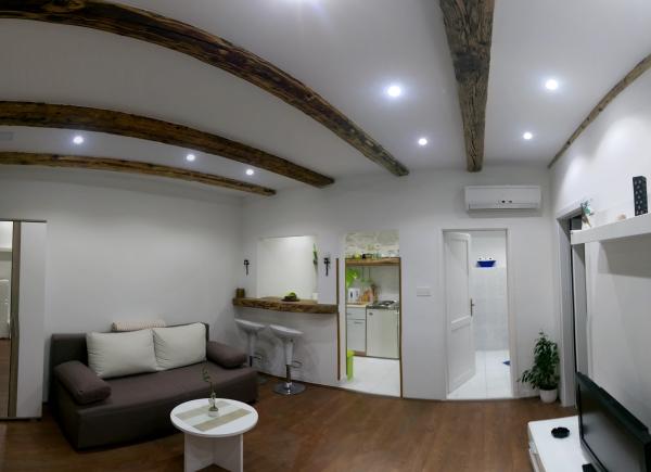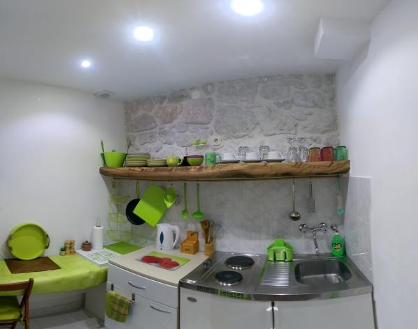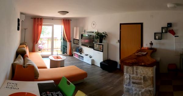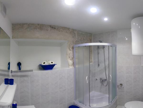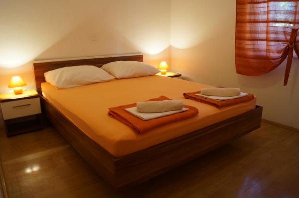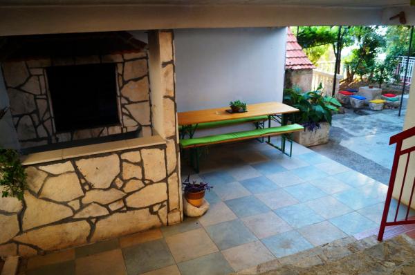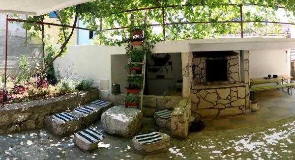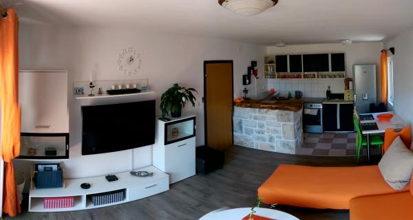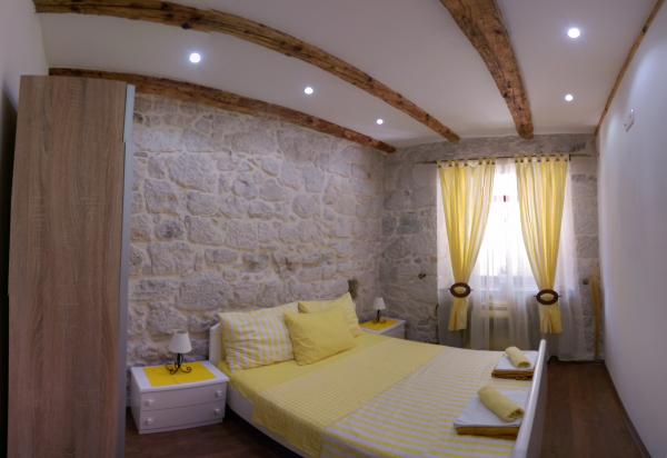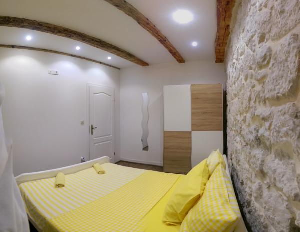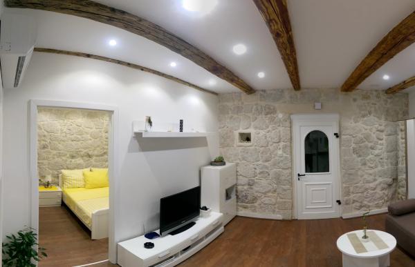 Kamena kuća sa dva novo uređena apartmana. Objekt se nalazi 5-6 minuta pješke nizbrdicom od centra Gradca, plaža, mora, restorana, kafića i trgovina. Prvi apartman (2 2) je apartman u kamenom dijelu kuće u prizemlju, potpuno restauriran u starom dalmatinskom stilu. Ima jednu sobu sa bračnim krevetom i dnevni sa kaučem koji se razvlači u dimenzije još jednog velikog kreveta za dvoje. Također ima i kuhinju te wc sa tuš kabinom. Apartman je opremljen klimom, internetom, LCD tv-om, satelitskom. Ima svoje dvorište sa stolom i stolicama. Drugi apartman (4 2) je na prvom katu kuće, ima dvije spavaće sobe sa dva bračna kreveta, veliki dnevni boravak sa kaučem na razvlačenje velikih dimenzija, veliku potpuno opremljenu kuhinju, wc i balkon sa stolom i stolicama. Apartman ima internet, klimu, LCD tv i satelitsku. Parking se nalazi iza kuće i besplatan je. Svim gostima je na raspolaganju cijela okućnica, vanjska kuhinja, prostorija sa mašinom za pranje rublja, roštilj i veliki stol sa stolicama
