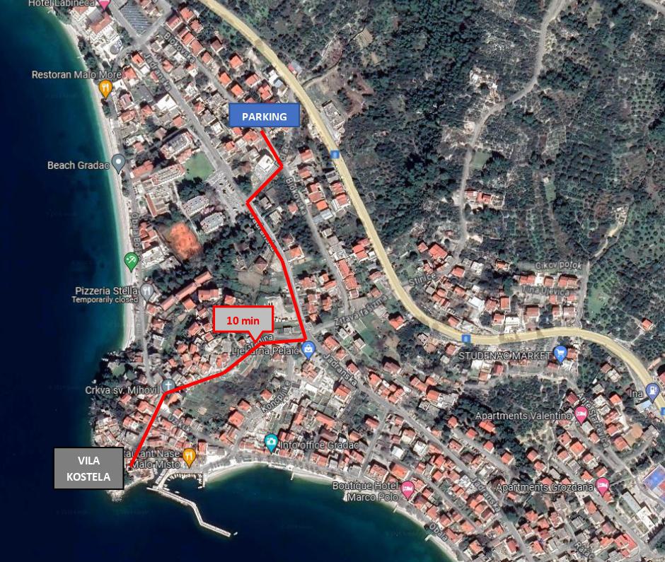 Do samog ulaza u Vilu Kostelu postoji kolni pristup (radi iskrcaja prtljage) dok je parking za sve naše goste osiguran na privatnom parkingu udaljenom 10 min hoda od objekta i uračunat je u cijenu.