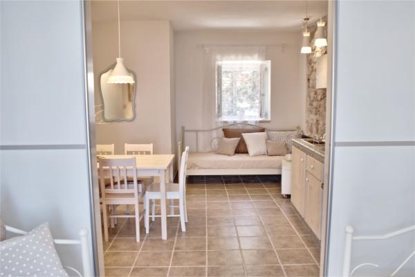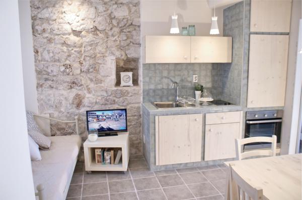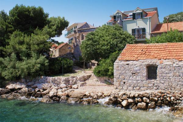 Kapacitet: 5 osoba Površina: 46 m2 Ap 1 i Ap2 nalaze se na tek renoviranom 1. I 2. katu Vile Kostele i sastoje se od dvije južno orjentirane spavaće sobe (jedna sa bračnim krevetom 160x200cm, a druga sa dva kreveta 90x200cm za jednu osobu), kuhinje sa blagovaonicom i dnevnim boravkom (sa jednim pomočnim ležajem 90x200cm za jednu osobu) te kupaonice sa tuš kabinom i nadsvjetlom. Apartmani imaju balkon i sobe sa pogledom na 10 m udaljeno more. Apartmani su klimatizirani inverter klima uređajima, imaju flat screen TV, kuhinju opremljenu pečnicom i staklokeramičkom pločom za kuhanje, dio namještaja posebno je dizajniran i rađen po mjeri te od punog drva, a dio je stari namještaj Vile Kostele koji je s puno ljubavi restauriran, svi vanjski otvori imaju integriranu mrežu protiv komaraca, a vodeći računa o ekologiji apartmani koriste najmoderniju tehnologiju sustava krovnog solarnog panela sa spremnikom za pripremu dovoljne količine tople vode.