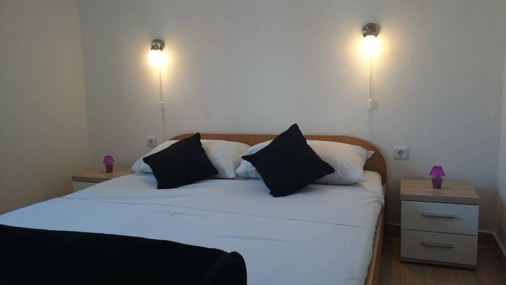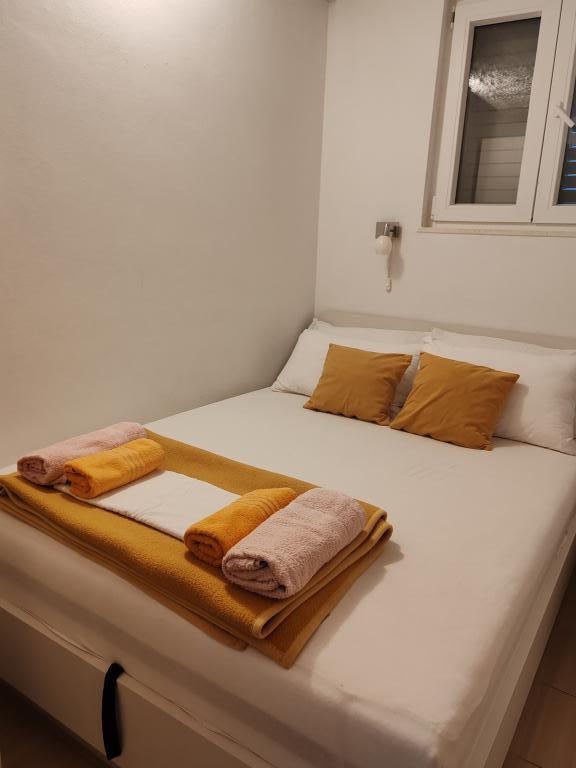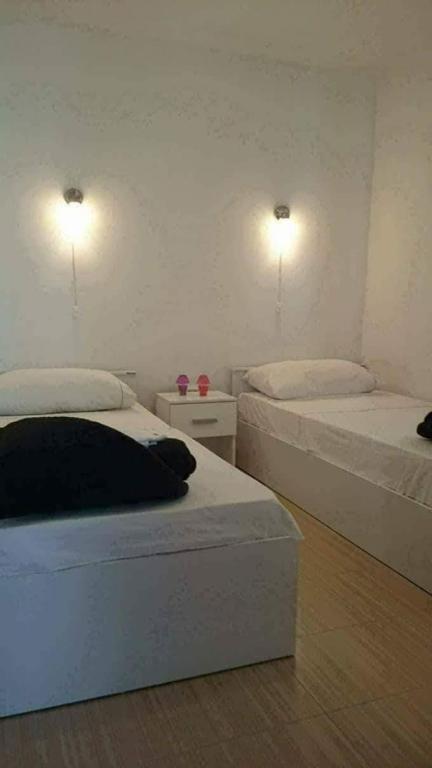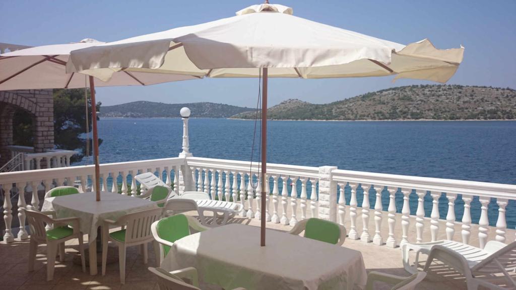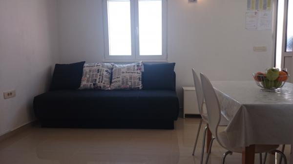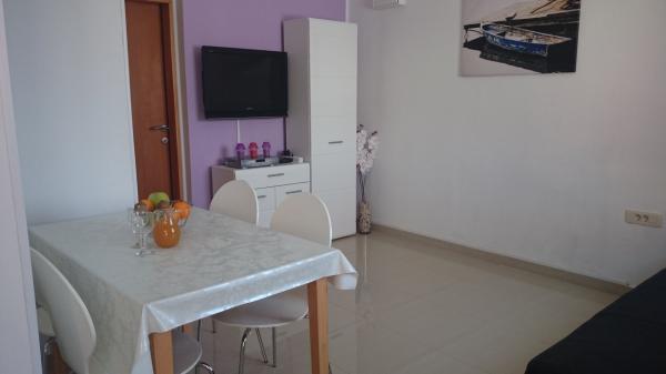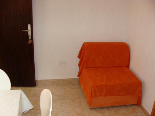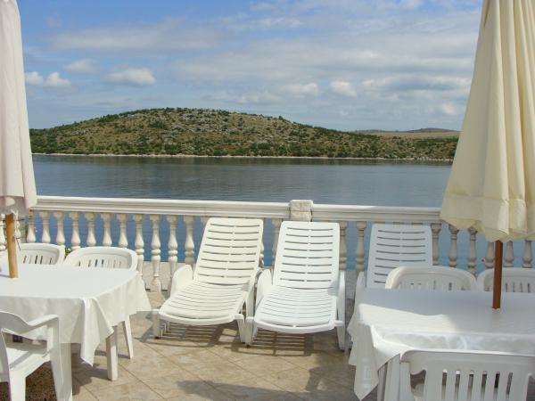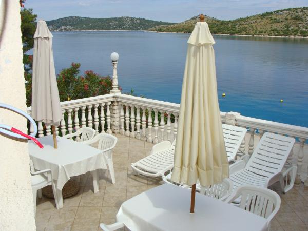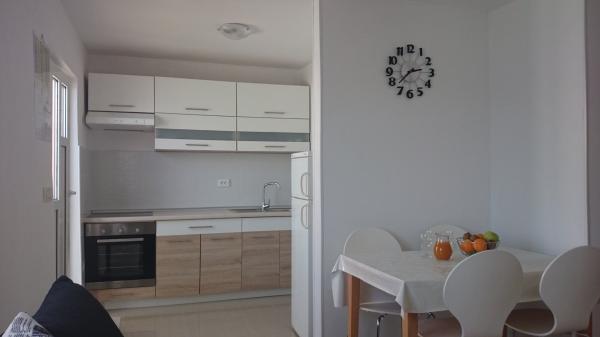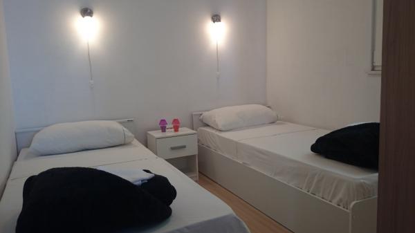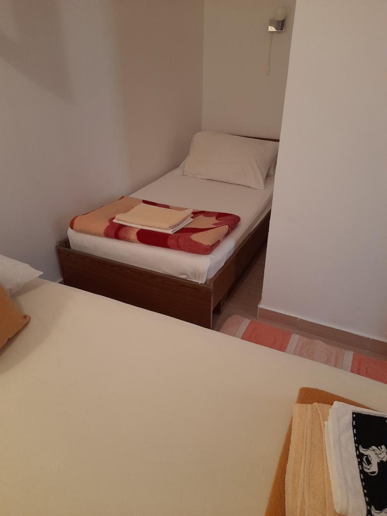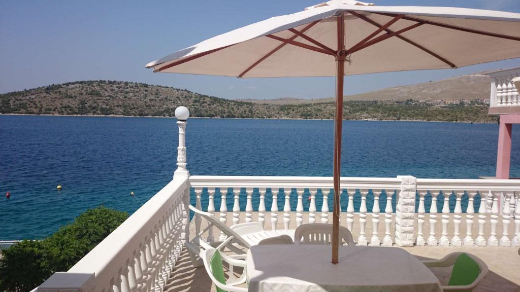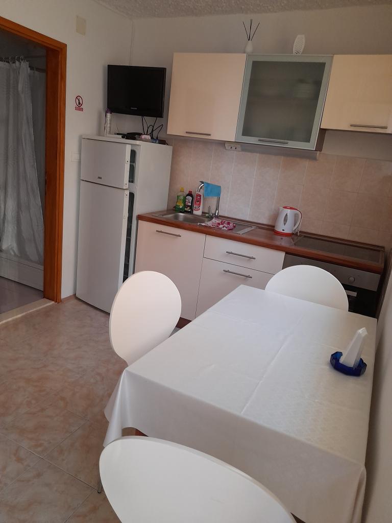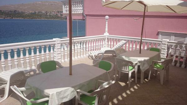 Apartmani 7 metara od mora za 7 - 8 osoba na jednoj terasi 34m2 sa pogledom na more. Apartmani imaju, kuhinju sa posuđem za kuhanje i serviranje, dnevnu sobu sa trosjedom za odmaranje ili spavanje, satelitsku TV, klima uređaj, internet priključak, 3 spavaće sobe (2 dvokrevetne sobe i 1 trokrevetna soba) sa ručnicima i posteljinom, pomoćni ležaj, kupaona sa tuš kabinom, wc i perilicom rublja, grill. Na terasi vrtna garnitura za 8 osoba, stolice za sunčanje, 2 bicikla, parking, plaža je 7 metara od apartmana. Imamo pokretni market (mini bus) što nas opskrbljuje sa osnovnim artiklima ispred apartmana. Ovo je idealno mjesto za odmor sa djecom, rodbinom ili prijateljima.