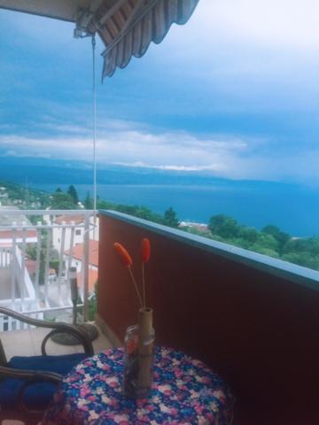 Studi apartman, uredan i kompletno opremljen za 2 osobe ili 2 1. Panoramski pogled na cijeli Kvarner, Cres, Krk. Parkirno mjesto ispred privatne zgrade besplatno. Apartman ima svoj ulaz, . i imate svoju intimu i na terasi. Poželjno za mlade ljude jer se nalazi na 4. katu u zgradi bez lifta. Udaljen samo 5 minuta autom do glavne plaže u Ičićima.