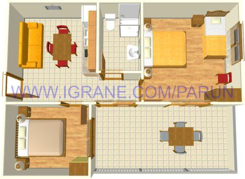 Apartmani Parun nalaze se u mjestu Igrane. Sam objekt smješten je na plaži u najljepšem dijelu mijesta koji nije daleko od centra a noću je tišina jer nema ugostiteljskih objekata u neposrednoj blizini. Objekt ima veliku okućnicu te je okružen cvijećem i zelenilom. Svaki apartman ima osiguran parking za jedno vozilo koji je uključen u cijenu.