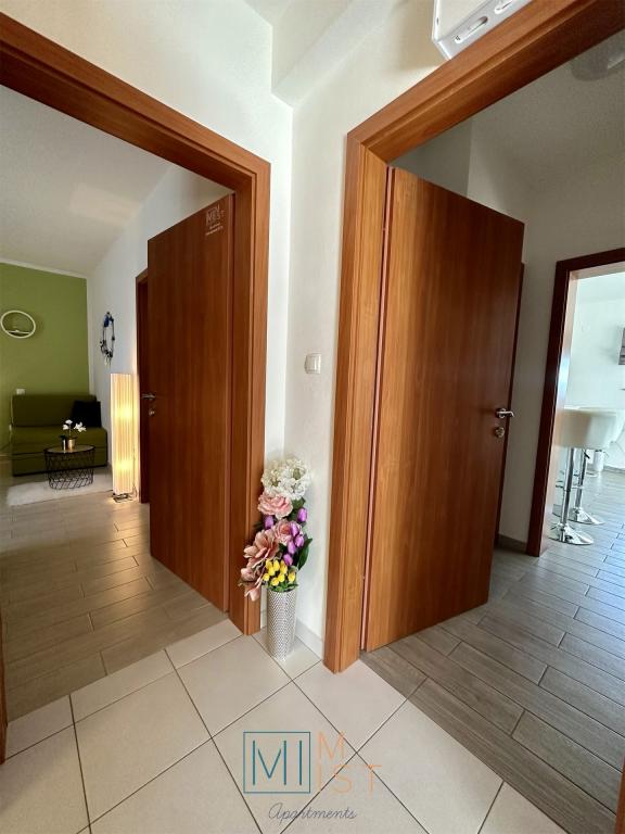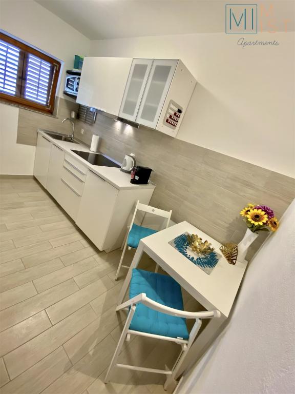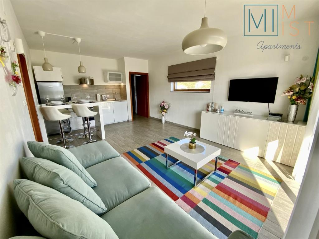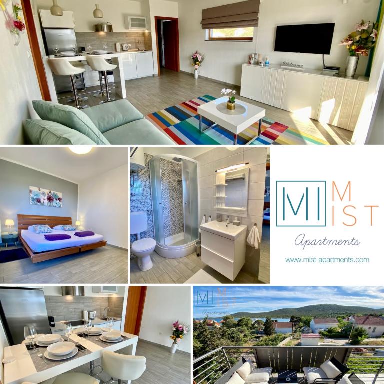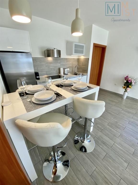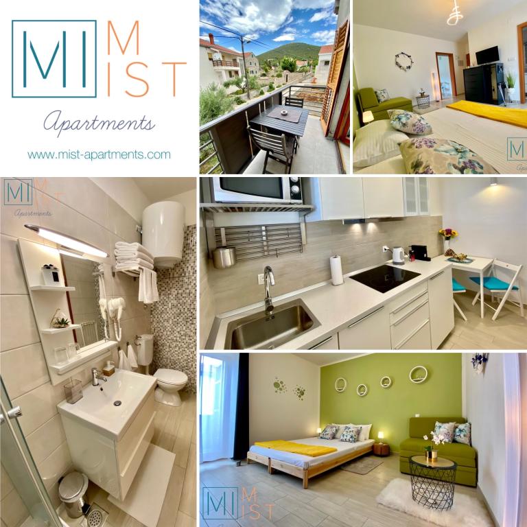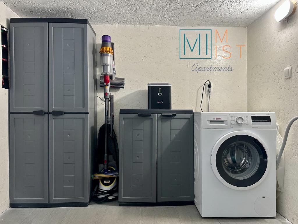 MIST apartmani dio su prvog kata kuće udaljene svega 100 metara od mora, a uređeni su s ciljem stvaranja toplog i modernog ugođaja daleko od vašeg doma. Bez obzira na to koji apartman odaberete, pronaći ćete uređenje koje je istovremeno privlačno i udobno. Kako bi vaš boravak bio što ugodniji, u podnožju stepenica na raspolaganju su vam perilica rublja s potrebnim deterdžentima, glačalo i daska za glačanje te usisavač i ledomat. Budući da vam je i mali vrtni roštilj na raspolaganju, sigurni smo da će stol (kutak za roštiljanje) u malom vrtu biti pun pogodak ukoliko ste grill majstor!