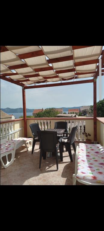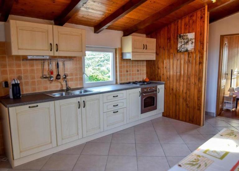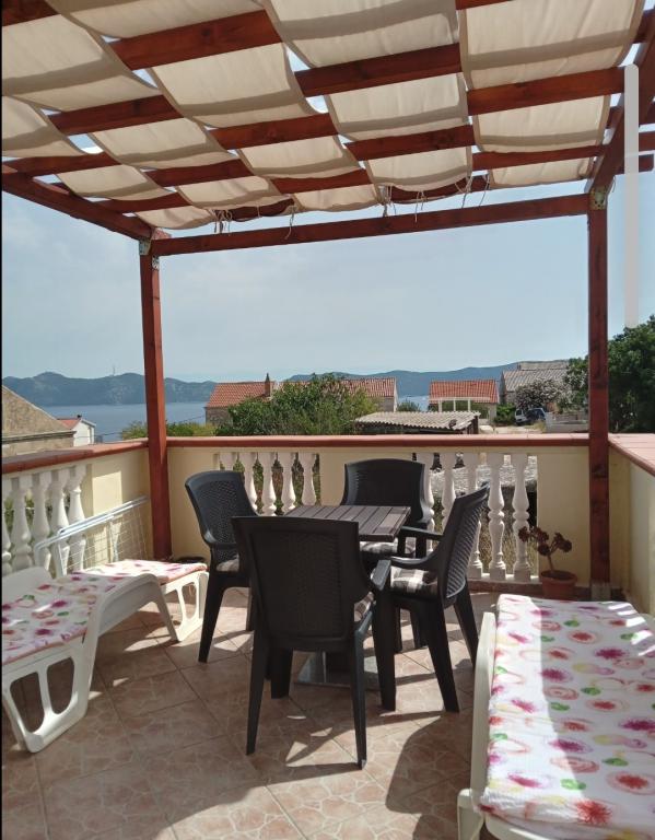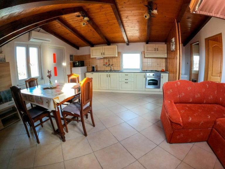 Apartman je smjesten u mirnom dijelu mjesta Mali Iž na samom vrhu brda , tako da ima lijep pogled na more i okolne otoke. Ima lijepu veliku terasu sa sjedecom garniturom i ležaljkama . Terasa je natkrivena pergolom. Ima svoje besplatno parkiraliste. Do mora ,plaze pjesice ima 10 minuta hoda , a tako i do trgovine. Apartman se sastoji od spavace sobe,kuhinje, dn. boravka , blagavaonice i kupaonice. U dnevnom boravku ima kutna garnitura koja se moze pretvoriti u dva lezaja. Ima klima , televizor, a kuhinja je opremljena sa perilicom sudja i kompletnim posudjem. U mjestu ima dva cafe bara, dvije pizzerie i više restorana. Ima trgovina. Plaze su kamene , sljuncane , betonske i pjeskovite. Ima puno borove sume, raznog zelenila i staza za pjesacenje. Na otoku je jos jedno naselje Veli Iz sa dvije trgovine, vise restorana i caffe bara.