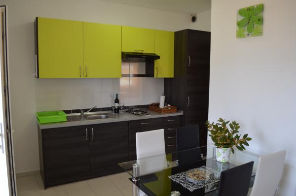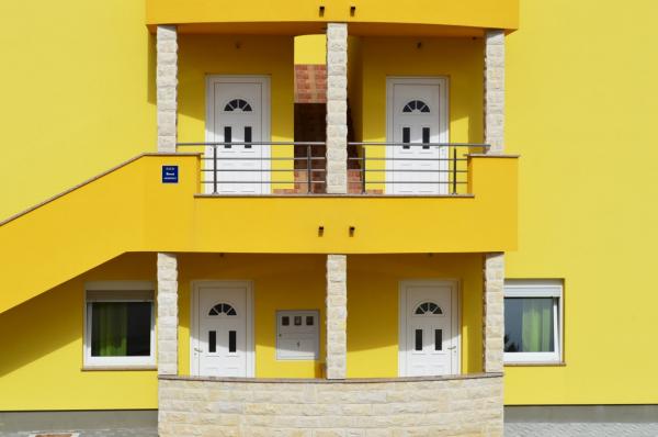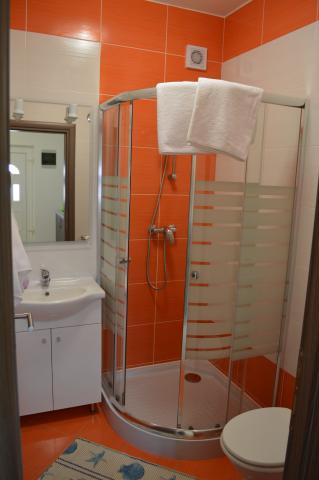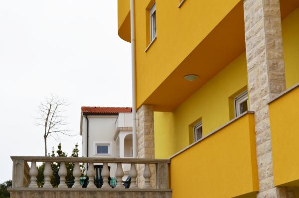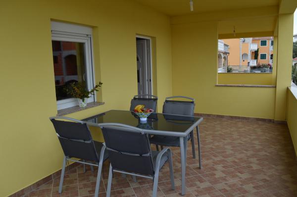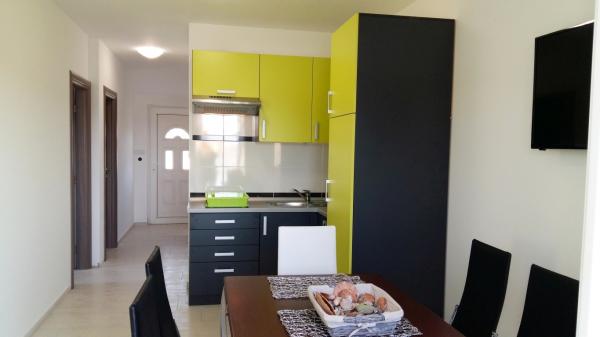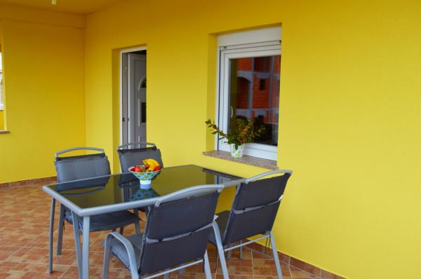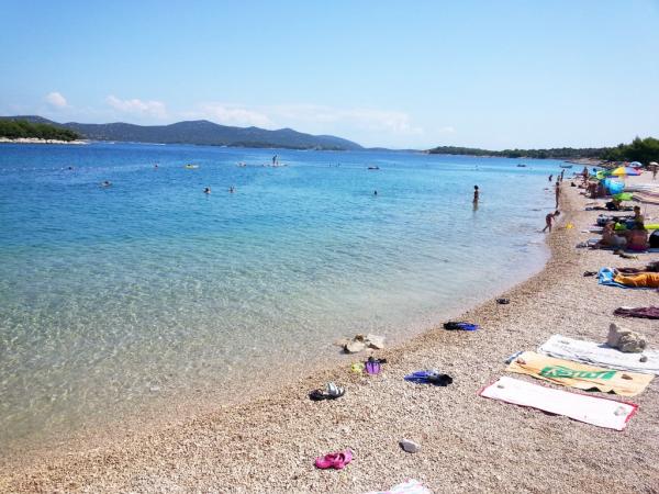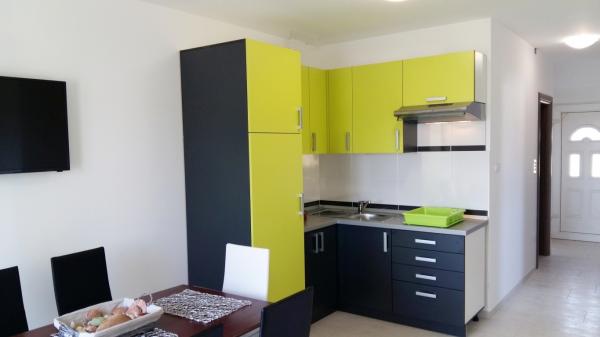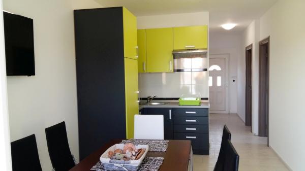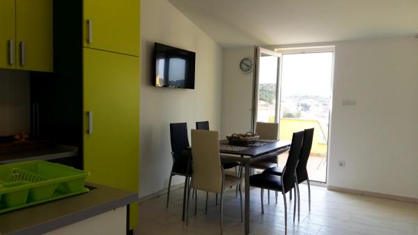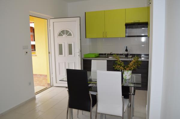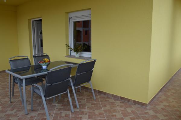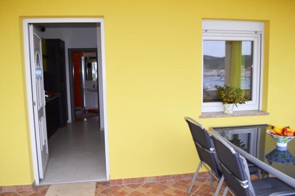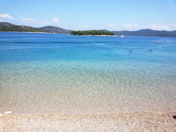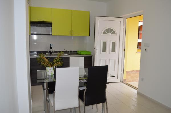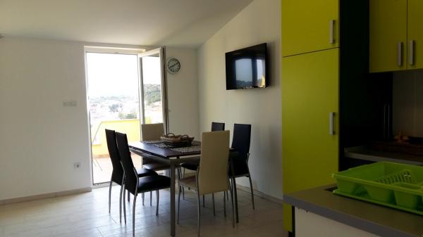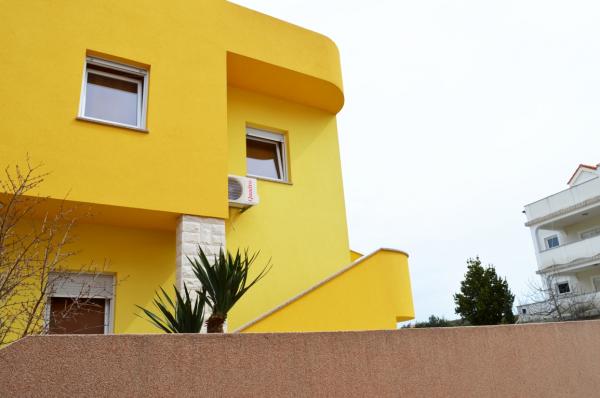Apartmani 1, 2, 3, 4 imaju jednu spavaću sobu, dnevni boravak sa dodatnim ležajem za još dvije osobe, kuhinju, kupaonicu i terasu. Pogled sa terasa pruža se s jedne strane na prekrasnu jezersku marinu, a sa druge strane na more okruženo otočićima, te jezerskom plažom. Apartmani 5 i 6 imaju dvije spavaće sobe, dnevni boravak sa dva pomoćna ležaja, kuhinju, kupaonicu i terasu18m2. Pogled sa terasa pruža se s jedne strane preko marine na cijelo mjesto, te s druge strane na more daleko prema Vodicama. Svi apartmani su opremljeni novim namještajem, klimatizirani, imaju LCD TV, SAT i neograničeni besplatni internet (wi-fi). Gostima je na raspolaganju parking, korištenje grilla. Do plaže potrebno je 2 min hoda, do centra mjesta, trgovina, benzinske crpke potrebno je do 5 minuta hoda.