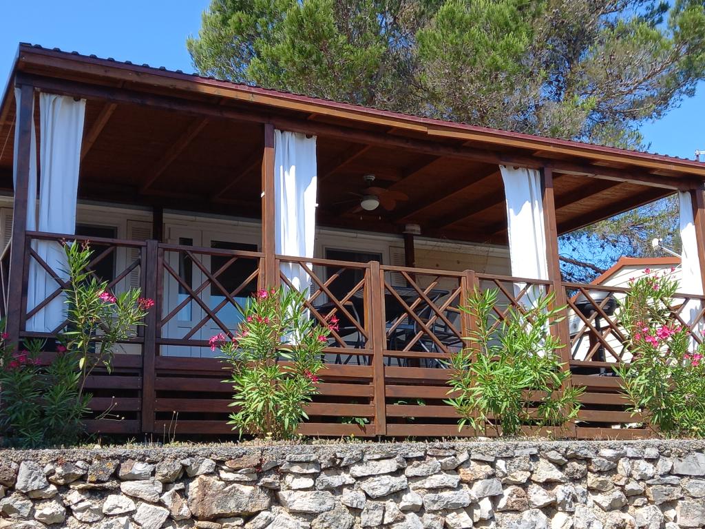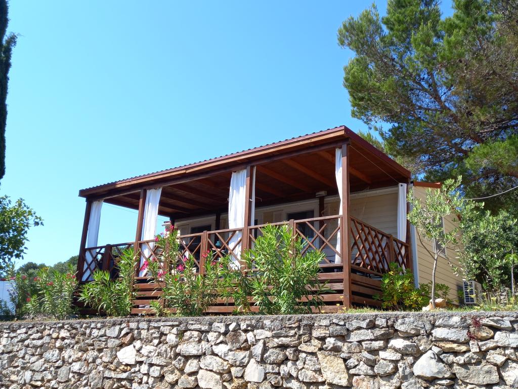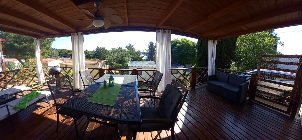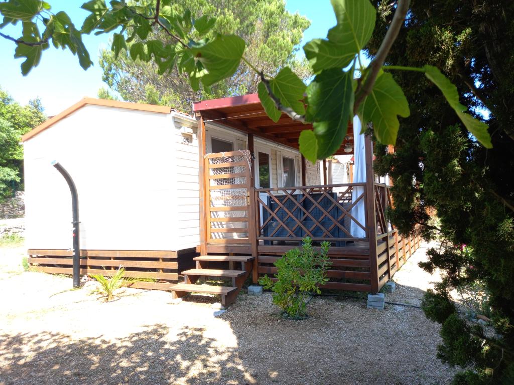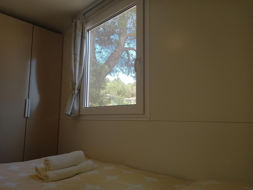 Luksuzno opremljena mobilna kućica (8x4m) kapaciteta 4 plus 1 osoba, nalazi se u prekrasnom kampu Jezera Village Lovišća na otoku Murteru. Kućica je smještena u mirnom djelu kampa svega 3 min hoda do plaže. Ima dvije spavaće sobe, dva kupatila sa tuš kabinom (sušilo za kosu na raspolaganju), plus vanjski tuš, te dnevni boravak sa potpuno opremljenom kuhinjom (pećnica, ploča za kuhanje, mikrovalna pećnica, hladnjak sa zamrzivačem, električno kuhalo, aparat za kavu, toster). Kućica ima klima uređaj (hlađenje/grijanje), te kablovsku TV, wifi. Velika natkrivena terasa 7x3 m opremljena roštiljem, garniturom za sjedenje i ručavanje, ležaljkama, te pogledom na more učinit će vaš boravak posebnim. Posteljina i ručnici su na raspolaganju (izmjena osmi dan boravka). Besplatno parkirno mjesto osigurano je uz samu kućicu.