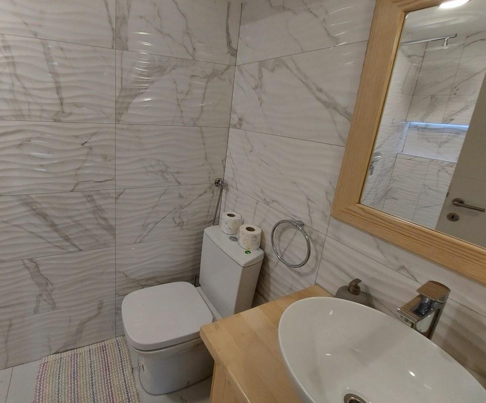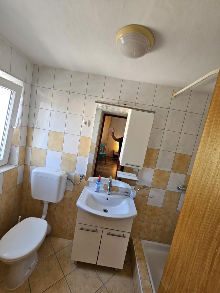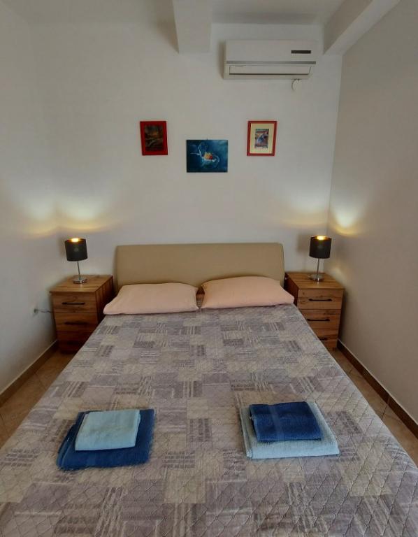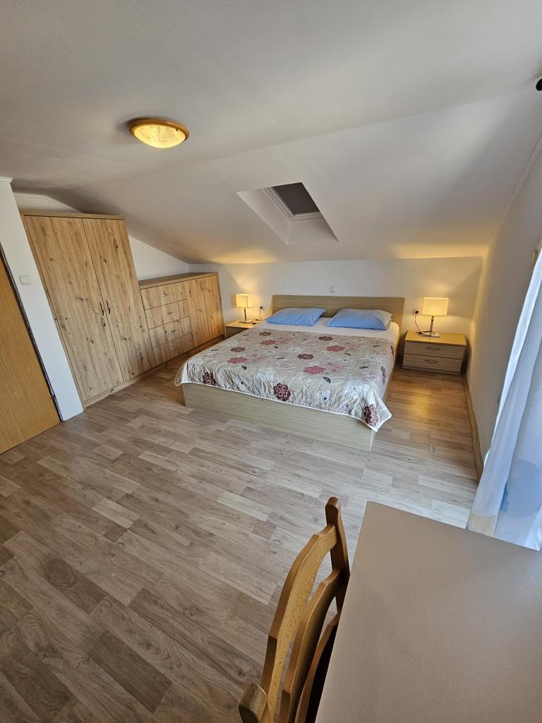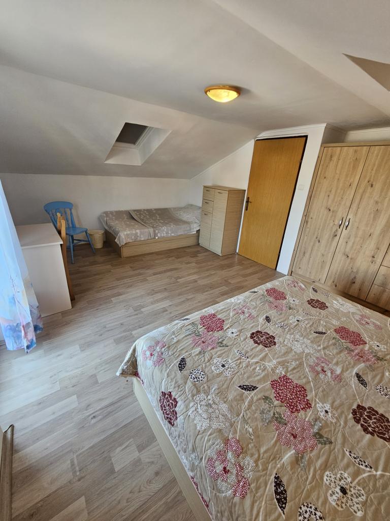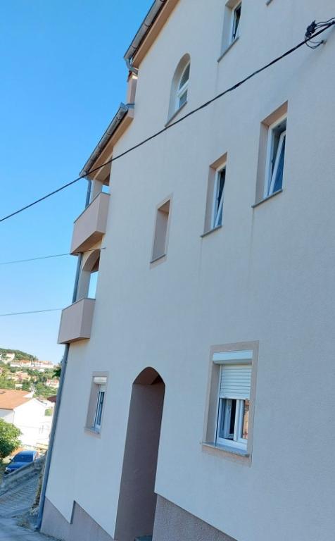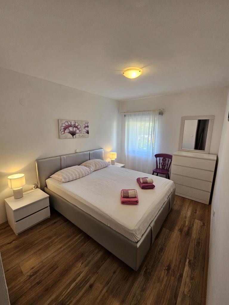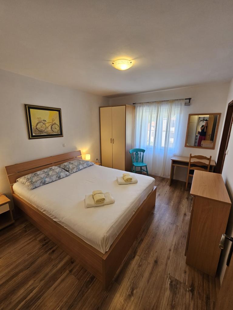 Obiteljska kuća s potpuno opremljenim trosobnim apartmanom na drugom katu. Predivan panoramski pogled na more. Stan ima natkrivenu terasu na koju se dolazi iz dnevnog boravka ,a na istoj etazi jos su dvije spavace sobe s kupaonicama (ulaz iz spavaće sobe). Gore u potkrovlju je treća spavaća soba iz koje se ide na ne natkrivenu terasu također s pogledom na more. Pored sobe je odvojena kupaonica sa perilicom rublja. Prva plaža udaljena je 5 minuta hoda od kuće,ostale plaže su udaljene od 100-200m i više. Nedaleko od kuće je šetnica uz more, dječje igralište, teniski teren, košarkaško igralište, boćalište, iznajmljivanje čamaca, bicikli, mopeda. Trgovina mješovitom robom, caffe bar ,mjenjačnica, salon za masaži, restaurant, pizzeria, lučica. Obiteljska kuća s ponudom za miran i lijepi godišnji odmor.