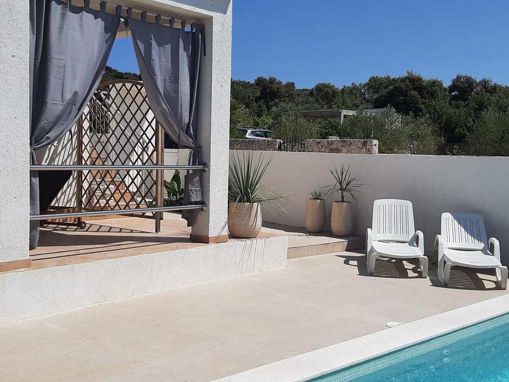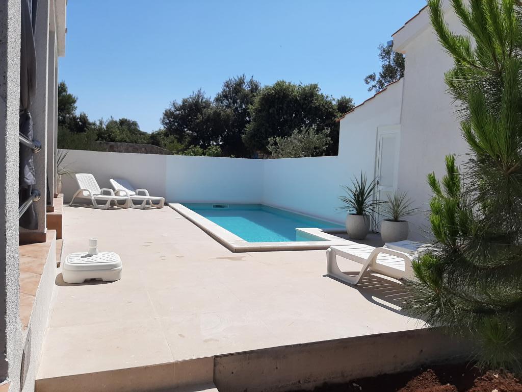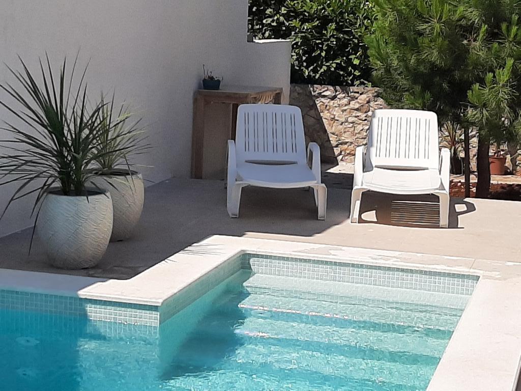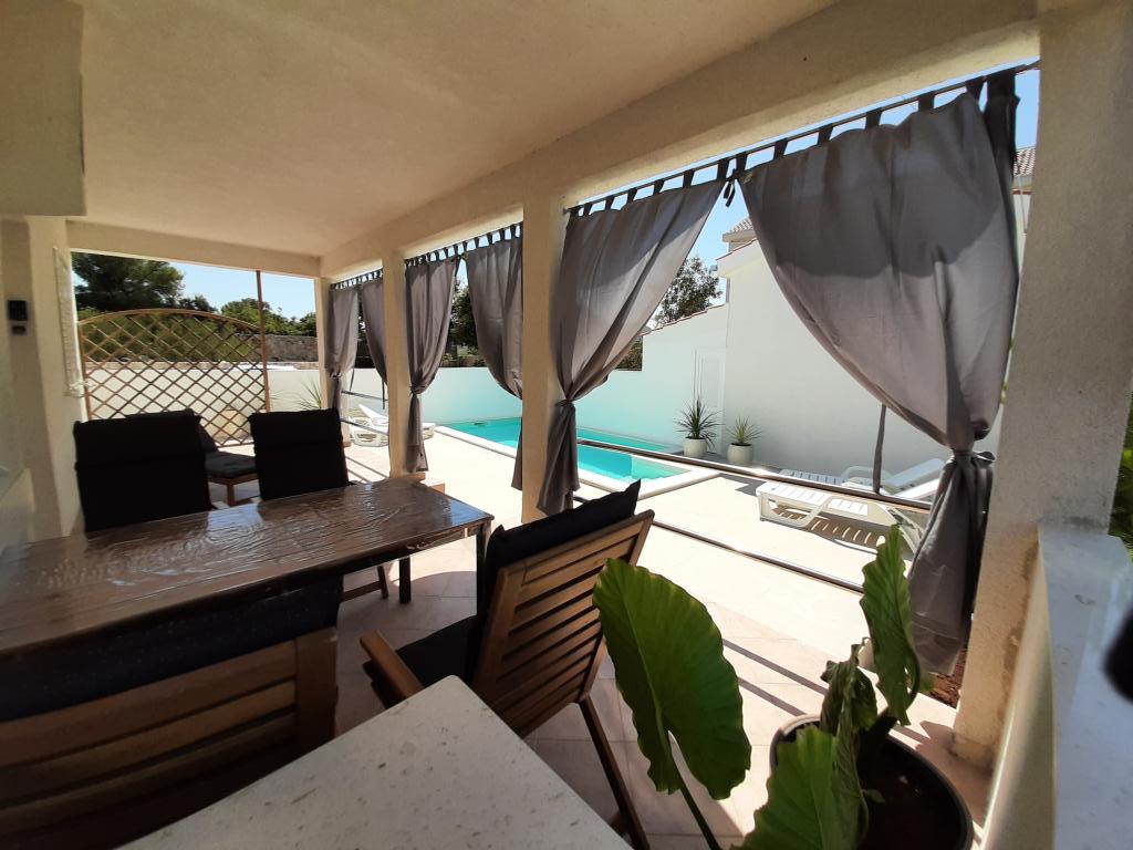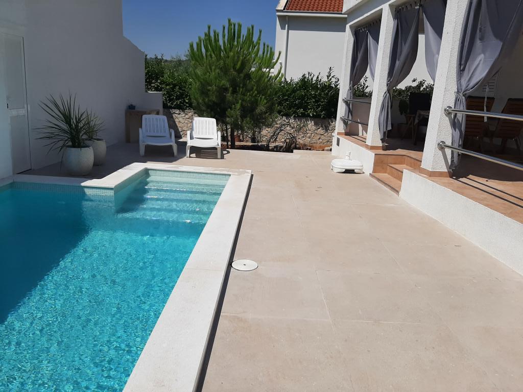 Kuća sa dva apartmana i vanjskim grijanim bazenom, kojeg koriste gosti oba apartmana, na 150m od mora: Manje vikendaško naselje Kanica udaljeno je 10km od Rogoznice, 20km od Trogira, 30 km od Šibenika... najbliža šljunčana plaža na 150m (restoran i bar uz plažu), a cijeli poluotok u radijusu manje od 500 m nenaseljen. Prekrasne plaže, čisto more i priroda. Dućan je na 3 km, a jutrom oko 8h kombi s osnovnim namirnicama (kruh, mlijeko, voće, povrće) dolazi ispred kuće. Uz kuću je parking i roštilj na korištenje za goste. Kuća ima dva odvojena dvosobna apartmana (jedan je u prizemlju za 5 osoba, a drugi na katu za 6 osoba) svaki zatvorenog prostora 48m2 s terasama od 20m2. Svaki apartman ima jedno (1) parking mjesto.