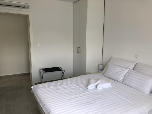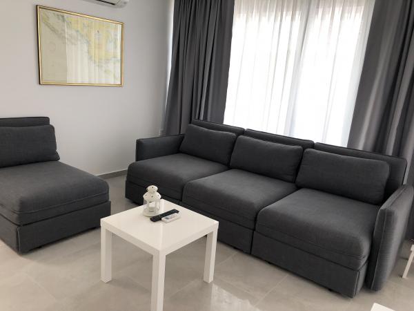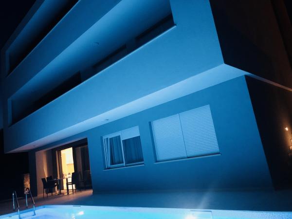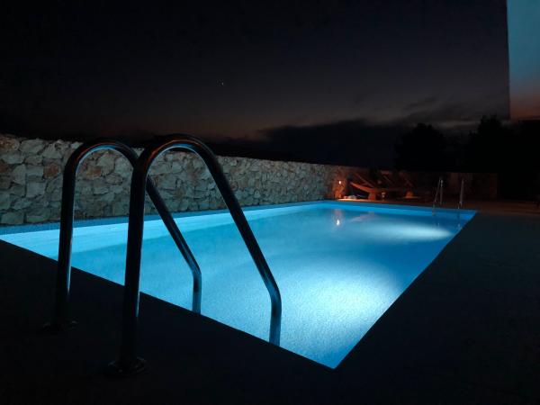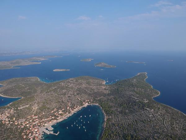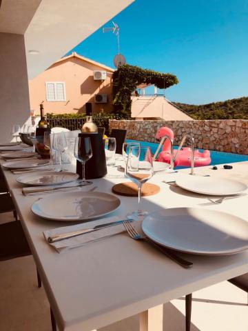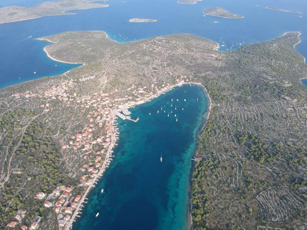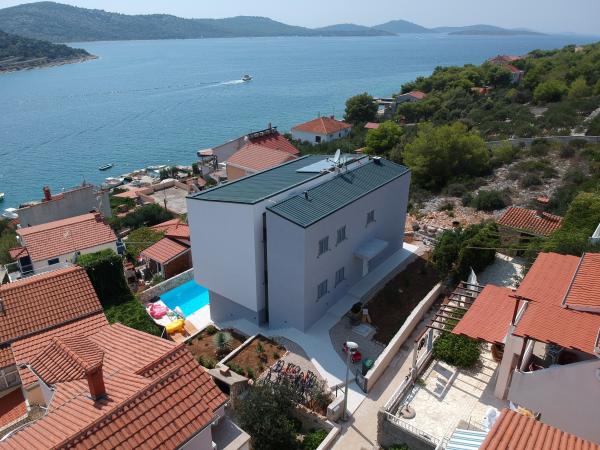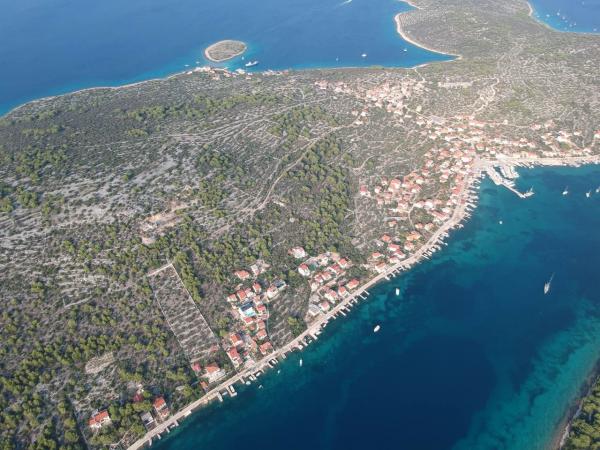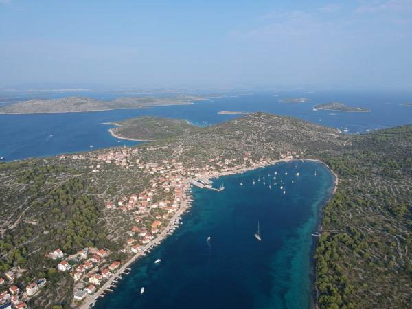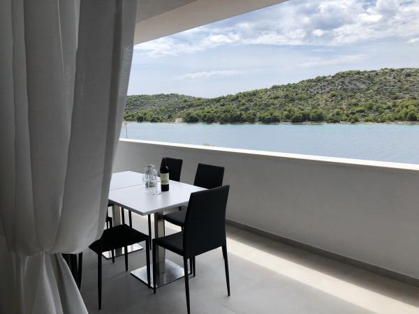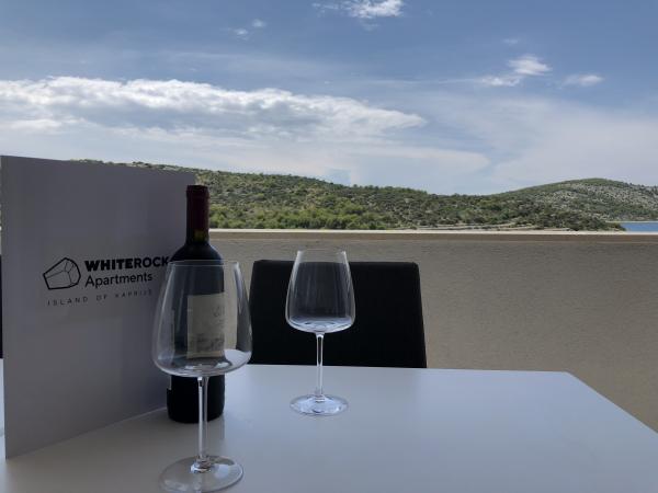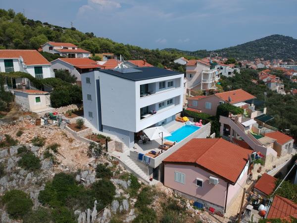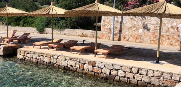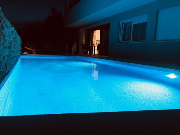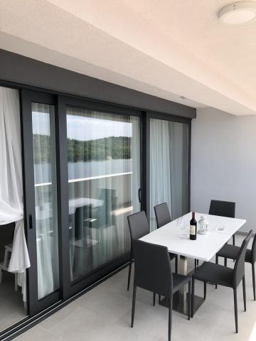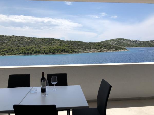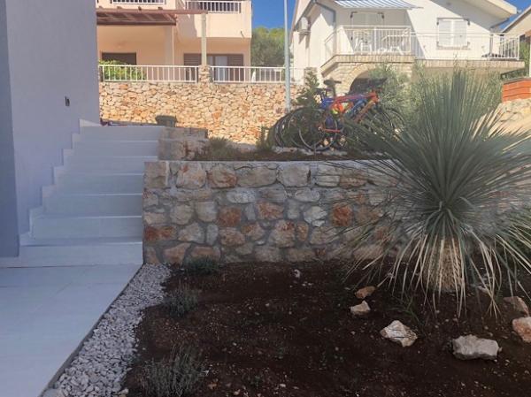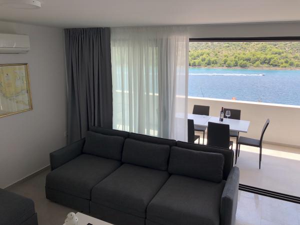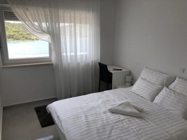 Luxurious apartments in a brand new villa on Kaprije Island in Sibenik archipelago. Beautiful mediterranean garden, private beach is located 150 meters from the house. Kaprije is a beautiful island with authentic landscape and way of life in mid Dalmatia. No cars, exotic nature, stunning beaches, magical sunsets and quiet, starry nights where you can only hear waves...Ideal both for unforgettable family vacation and a romantic holiday... Apartments have all things that you are used to in a modern way of life. Hand-crafted furniture and beds and top quality appliances. Two deluxe bedrooms with double bed and four premium quality sofas in a living room. It can accomodate up to 8 guests. Silk blankets, bamboo pillows, lavander mattresses... Two bathrooms with walk in showers. Fully equiped kitchen with dishwasher and washing machine hidden in a built-in closet in a hall. All rooms are equipped with AC units. Free WIFI. On the Rocks apartment has exclusive access to 32m2 pool.