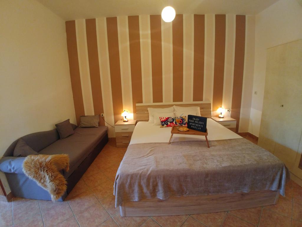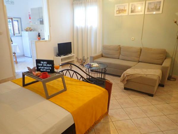Apartman je bio čist i uredan, okoliš objekta je super za sjesti i uživati. Domaćini su bili izvrsni - ljubazni i spremni odgovoriti na sva pitanja. More je jako lijepo i čisto, možda najčišće od svih mjesta na kojima smo bili. Stvarno je sve blizu, nisam upalio auto cijeli odmor...