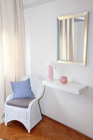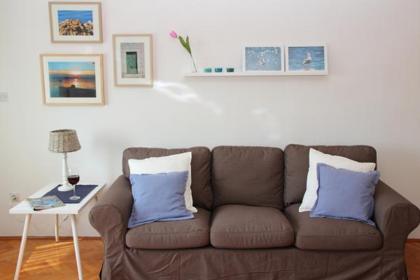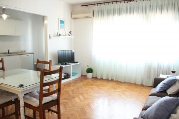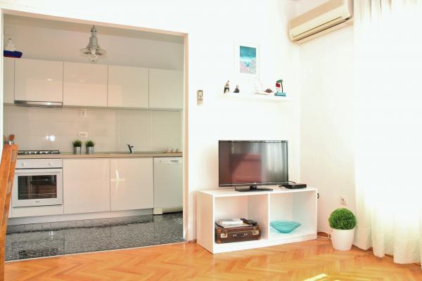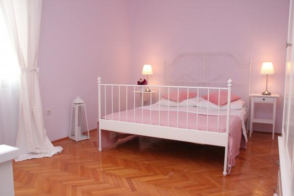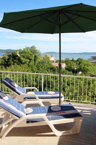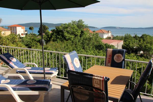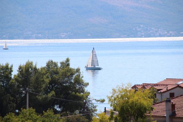 Komforan i kompletno opremljen dvosobni apartman s pogledom na more. Smjesten je u mirnom predjelu Kastel Kambelovca, okruzen zelenilom mediteranskog bilja smokvama ,tresnjama, mandarinama, vinovom lozom, maslinama. Apartman (85 m) zauzima prvi kat obiteljske kuce, smjestene na parceli od 4000m. Ima prostranu, juzno orijentiranu terasu (30m) s koje se pruza predivan i opustajuci pogled na Kastelanski zaljev. Udaljen je svega par minuta hoda do mora, plaza ,parka, setnice, restorana, ducana. Provedite svoj odmor u Kastelima, gradu sa sedam sela podno padina Kozjaka. Osjetite zivot dalmatinskog mjesta. Probudite se uz miris mora i cvrkut ptica. Obidite njegove utvrde ,dvorce, crkvice, porte, prosetajte njegovim ulicicama. Kusajte autohtonu domacu hranu u vrhunskim, cijenom pristupacnim restoranima. Posjetite Split i Trogir udaljeni su svega 10 km, vjerujemo da cete provest nezaboravan odmor.
