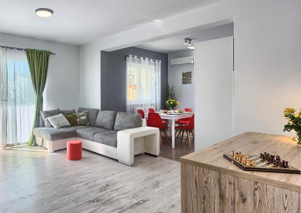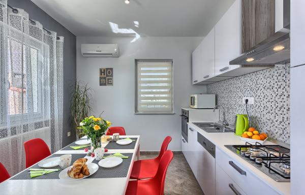 Dragi gosti, naš novouređeni apartman se nalazi u prizemlju obiteljske kuće u mirnom dijelu Kaštel Novog, udaljen 700m (10 min) od mora i plaže, u neposrednoj blizini bogatih kulturnih znamenitosti UNESCO-vih gradova Trogira (8km, 10min), Splita (16km, 20min) i Solina (10km, 15min). Plaže u Kaštel Novom su šljunkovite i pjeskovite, pogodne za djecu i odrasle i protežu se u duljini 3 km. Naše mjesto je poznato po dugim šetnicama uz obalu koje obiluju parkovima, restoranima, srednjovjekovnim utvrdama, kao i zabavama u mjestu u okviru Kaštelanskog kulturnog i zabavnog ljeta. Aerodrom je 4km od nas, sa naše lokacije je vrlo lako organizirati izlete prema unutrašnjosti (nacionalni parkovi, Dalmatinska Zagora) ili prema otocima (Čiovo, Brač, Hvar, Vis). Dobrodošli, želimo Vam ugodan boravak