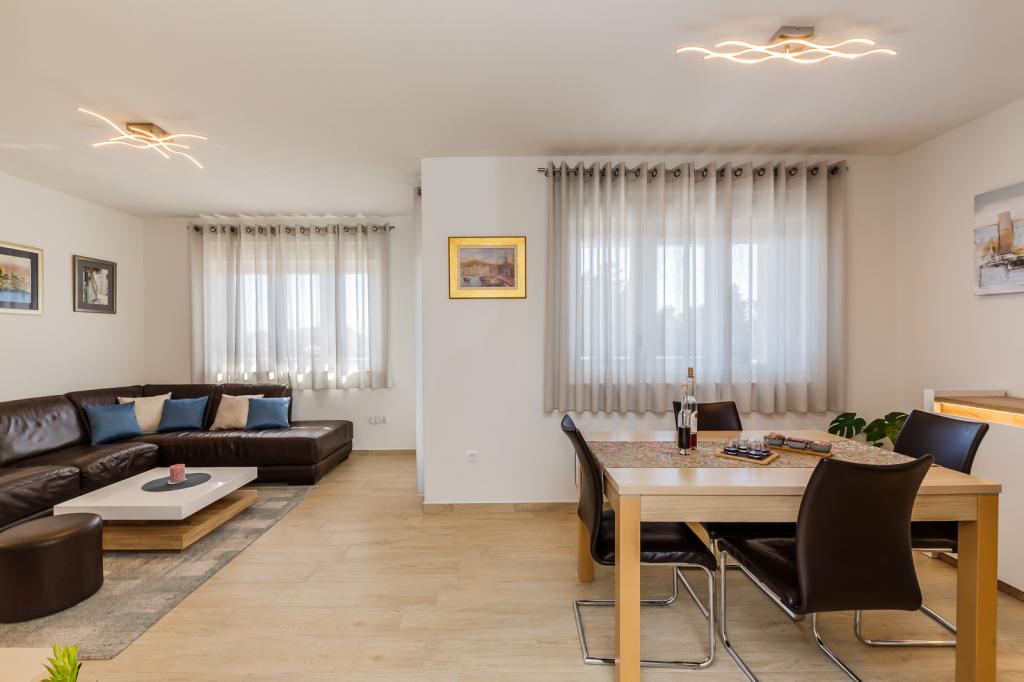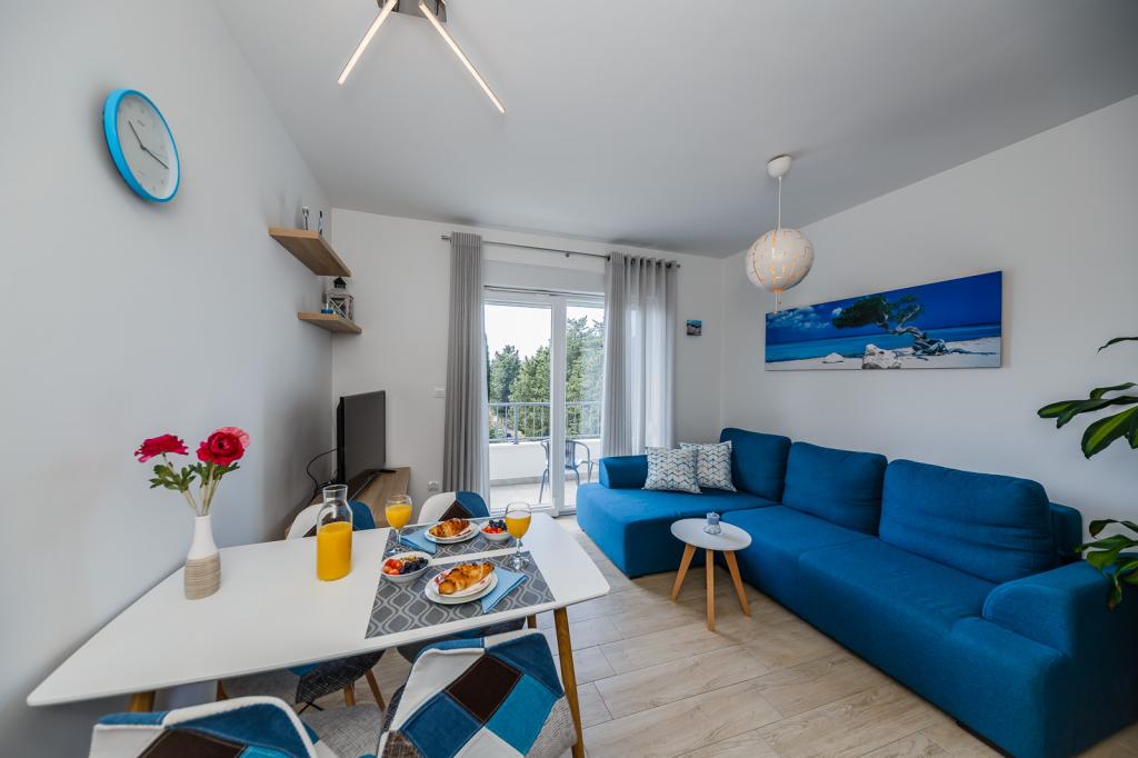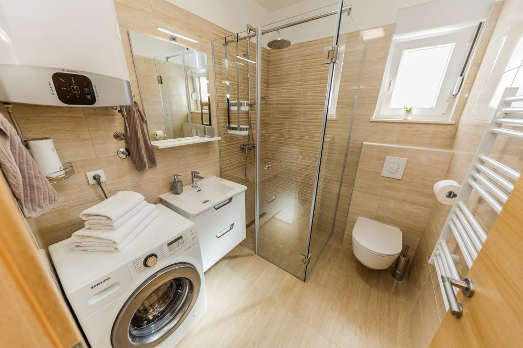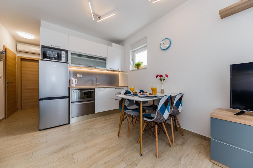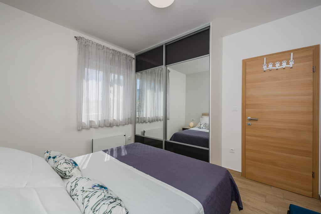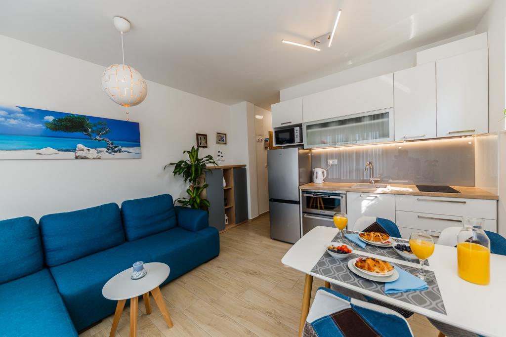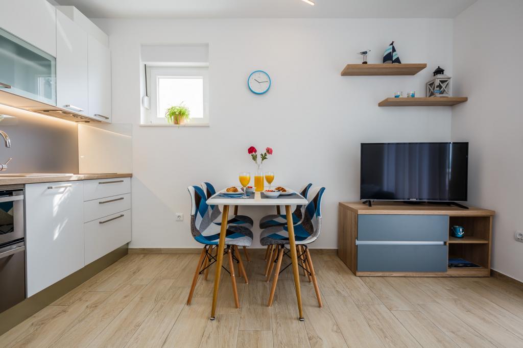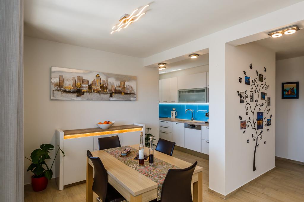 Letujemo u Hrvatskoj svake godine već 26 godina, ali oprema ovog apartmana (perilica rublja, perilica suđa, pećnica, sušilo za kosu, aparat za sendviče, mikser) i, naravno, sve sitnice, aluminijska folija, kuhinjske krpe, i ono što me iznenadilo su ručnici, u svim količinama, i hladno piće su nas čekali. Blizina vode je odgovarajuća, pogled s obale je prekrasan, voda čista i topla. Naravno, stan je namješten vrlo modernim i ukusnim namještajem. Hvala, Damír