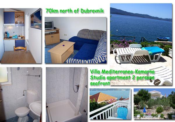 Smješteni u samom srcu Komarne, apartmani Mediteraneo nude 7 kompletno opremljenih smještajnih jedinica prilagođenih vašim potrebama koji mogu primiti 2, 3, 4, 5 ili 7 osoba. Apartmani se sastoje od spavaće sobe, dnevnog boravka, kuhinje s blagovaonicom, toaleta s tuš kadom i balkonom s pogledom na more. Smješteni prvi red do mora pružaju prekrasan pogled na poluotok Pelješac. Na raspolaganju je i zajedničko korištenje roštilja i vrta s ležaljkama koje stepenicama vode direktno do mora. Na udaljenosti od par stotina metara možete naći dućan, restoran, bar, sportske aktivnosti i druge rekreativne sadržaje.