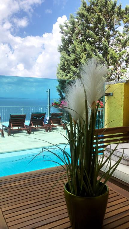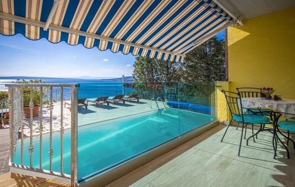 Apartman se nalazi u prizemlju obiteljske kuće u mirnom, primorskom, ribarskom mjestu Klenovica. Moderno i bogato opremljen visokim standardima s vlastitim vanjskim bazenom kojeg koriste isključivo gosti ovog apartmana. Osim bazena apartman posjeduje dvije terase; jedna velika terasa ima panoramski pogled na more, a druga, manja terasa ima roštilj. Na obje terase imate mir i privatnost. Apartman ima dva parkirna mjesta. Smještaj apartmana je povoljan ukoliko želite posjetiti nacionalne parkove ili bliže otoke npr. Krk, Lošinj, Rab ili Cres te za iste postoje organizirane turističke ture brodom iz centra mjesta. U apartmanu je dozvoljen boravak do dva kućna ljubimca. Plaža za pse nalazi se oko 7 min. vožnje od apartmana. Apartman je dobro ograđen na obje terase, što je povoljno za manju djecu i kućne ljubimce. Apartman na katu ima 4 ležaja ,moderan i kvalitetno opremljen.Nema korištenje bazena osim kad je skupina iste obitelji ili prijatelja. Balkon,parking,pogled na more,klima,int