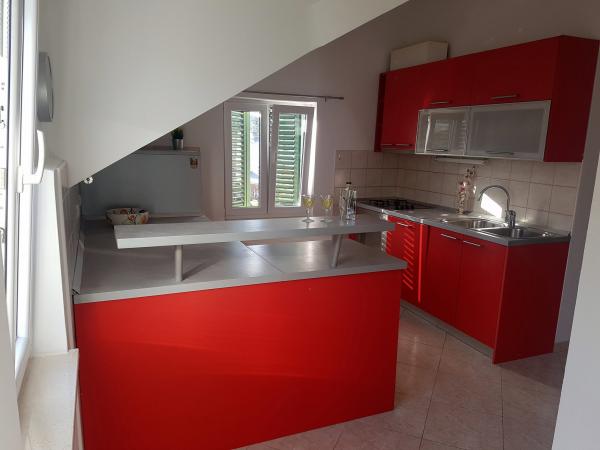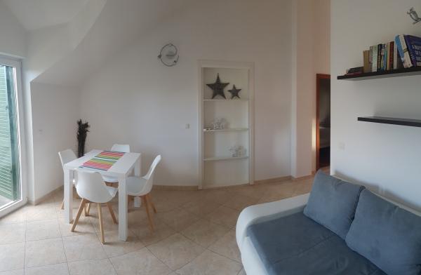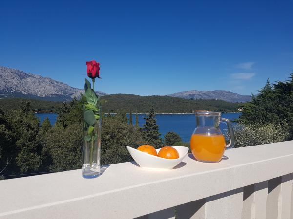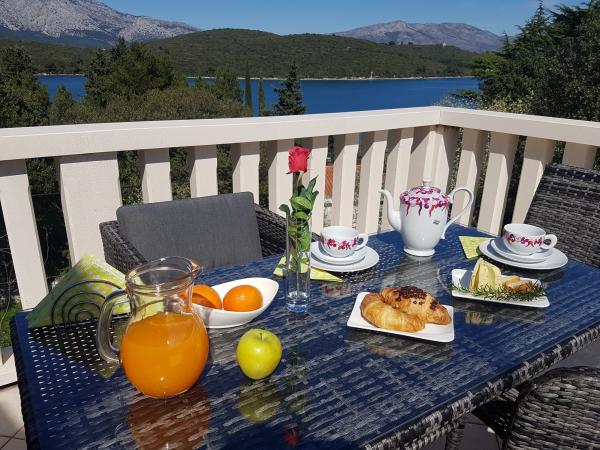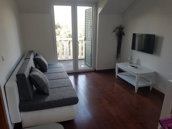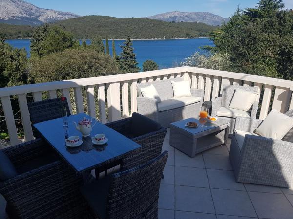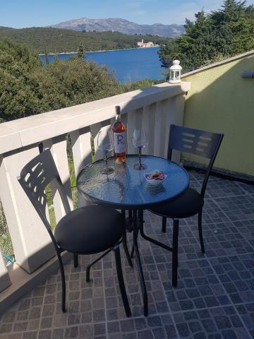 Prostrani apartman, smješten u potkrovlju obiteljske kuće. Uz vlastiti balkon sa pogledom na more, posjeduje i veliku terasu koja je uređena za popodnevno odmaranje. Objekt se nalazi 40 metara od mora, 600 metara od shopping centra, i 3 kilometra od samog centra Korčule. Kuću okružuje borova šuma, izrazito mirnog karaktera idealnog za odmor.