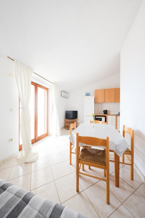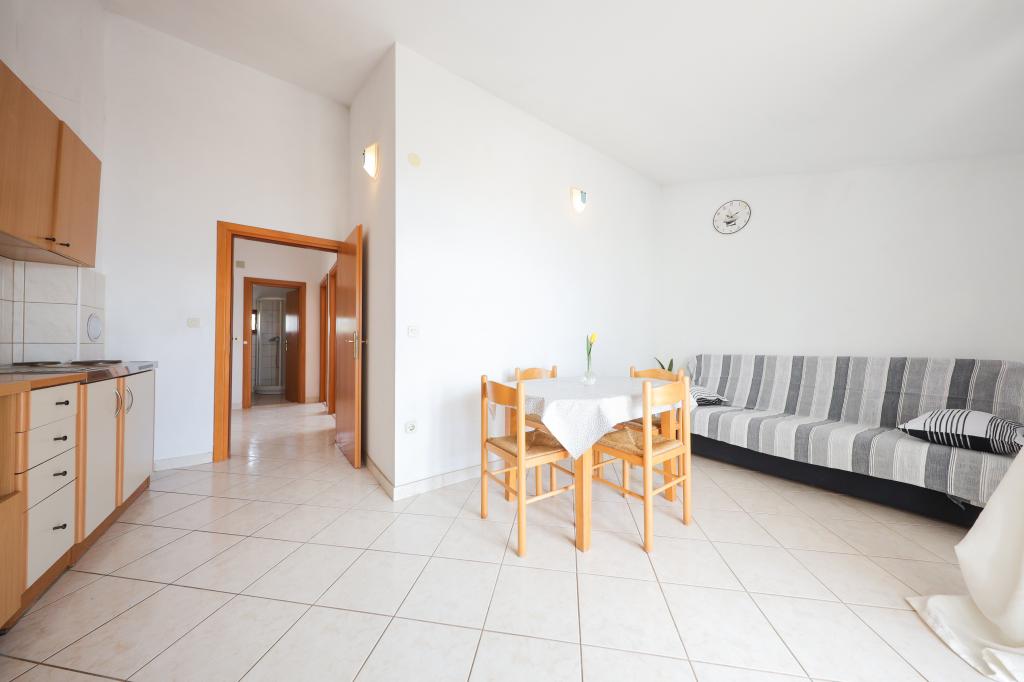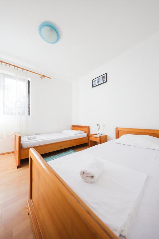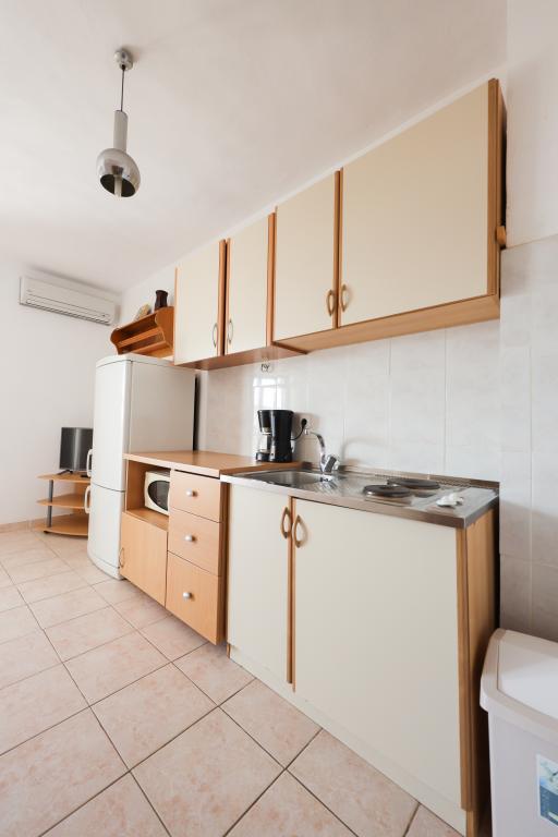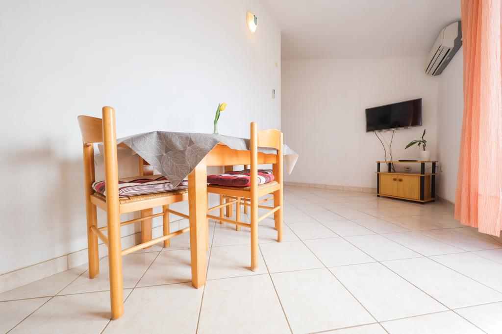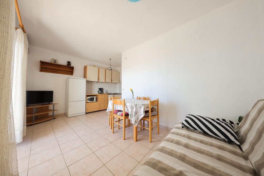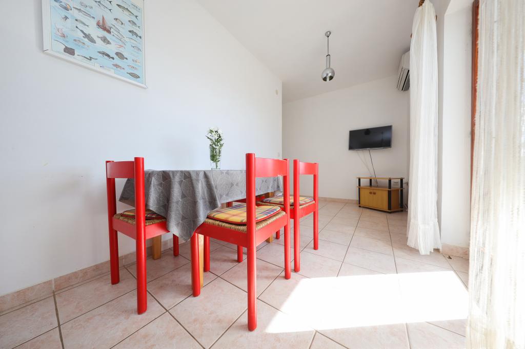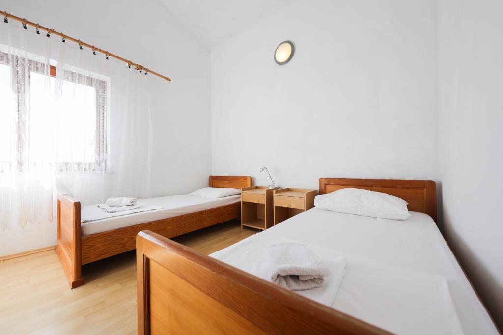 Plaža je udaljena 40 metara. Apartmani su prikladni za 4 osobe, (moguće 5). Imaju dvije odvojene spavaće sobe po dva kreveta (2 bračna kreveta, 2 odvojena), terasu sa pogledom prema moru. Apartmani sadrže potpuno opremljenu kuhinju, kupaonicu (ručnici uključeni), spavaće sobe sa posteljinom, osiguran parking. Moguće je koristiti vanjski roštilj. Na zahtjev možemo staviti dječji krevetić.