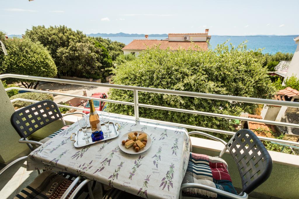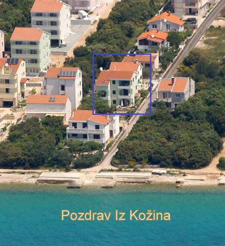 Apartmani se nalaze u mirnom dijelu Kozina. Blizina Zadar 7 km. Samo 20 met. do plaže ,suncobrani i ležaljke na raspolaganju. Svi apartmani imaju terasu s pogledom na more. Apartman A-2 +2 i A- 4 nalaze se na prvom katu. Svi apartmani imaju kuhinju sa štednjakom, pećnicu, hladnjak, zamrzivač, čajnik, aparat. za kavu, toster, pegla, posteljina, ručnici, kuhinjske krpe, izmjena za 7 dana. po potrebi i češće, pribor za pranje i čišćenje. Apartman za 6 osoba ima stroj za pranje rublja, stroj za pranje posuđa. , mikrovalnu peč, aparat za kavu, toster i čajnik. Vlastiti parking u hladu za sve goste- Mjesto na plaži na zahtjev gosta. Promet automobila samo za stanare i goste ulice. Sigurno za djecu. U hladovini stabala se nalazi roštilj sa prostranim stolom i klupama za druženje. Suncobrani za plažu su na raspolaganju gostima -gratis. Wi-Fi gratis..