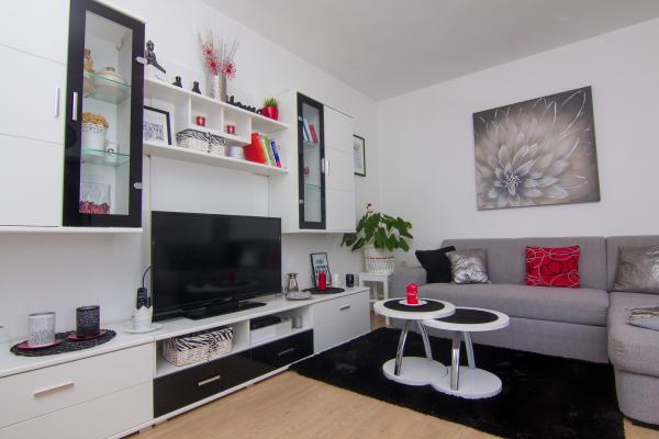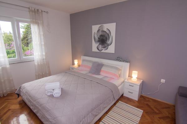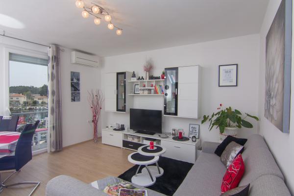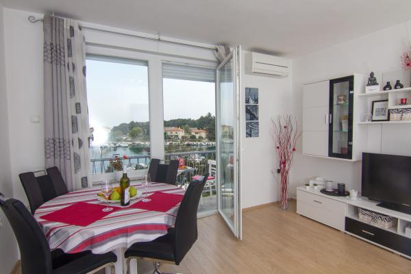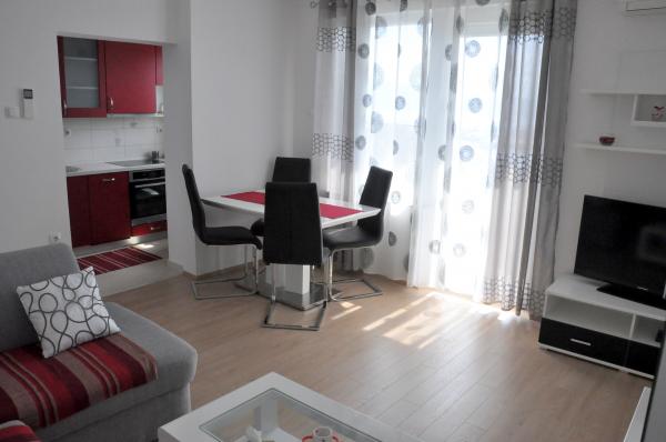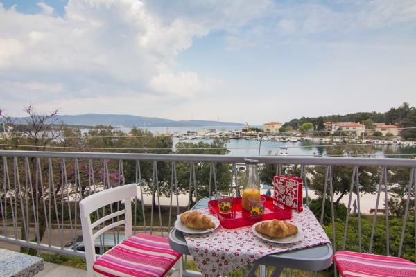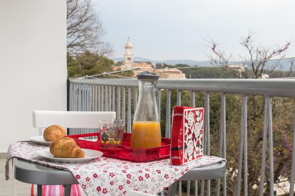 Potpuno nov i suvremeno opremljen apartman u centru grada, na 2. katu zgrade, samo 20 metara od mora. Sa balkona se pruža divan pogled na krčku katedralu, šetalište uz more i marinu-luku. Besplatan internet i parking. Restorani, trgovina, ribarnica, tržnica, banka, ljekarna i benzinska postaja udaljeni su svega 100 metara a plaža 200 metara.