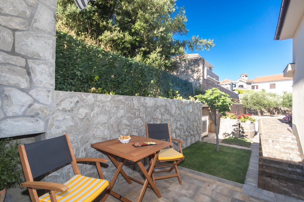 Apartman NATALIJA nalazi se u mirnom predjelu grada Krka, Površina apartmana je 35 m2, a pripadajuće terase 14 m2. Apartman je smješten u prizemlju obiteljske kuće, sa velikom okućnicom, okruženom maslinama. Predivan pogled na more iz apartmana i sa terase. Apartman je skoro nov ( u upotrebi 2 sezone ) i moderno uređen, klimatiziran, opremljen sa svim potrebnim za udoban boravak, sa besplatan wi-fi, te sa besplatnim parkiralištem za osobni automobil u dvorišu kuće. Studio LUCIJA nalazi se u istom objektu. Površina studija je 25 m2, a pripadajuće terase 1o m2. Studio je smješten u prizemlju obiteljske kuće, sa velikom okućnicom, okruženom maslinama. Kapacitet je 2 osobe koje spavaju na udobnom kauču na razvlačenje. Studio ima pogled na okućnicu. Nema pogled na more. Studio je nov ( u upotrebi od sezone 2019 ) i moderno uređen, klimatiziran, opremljen sa svim potrebnim za udoban boravak, sa besplatan wi-fi, te sa besplatnim parkiralištem za osobni automobil u dvorišu kuće