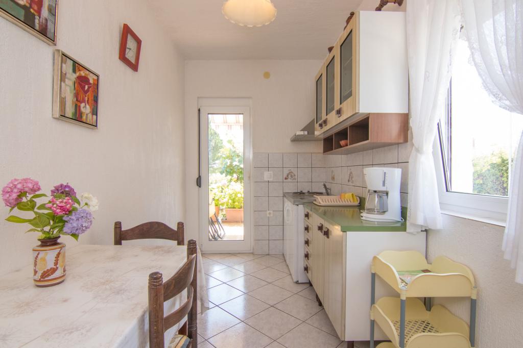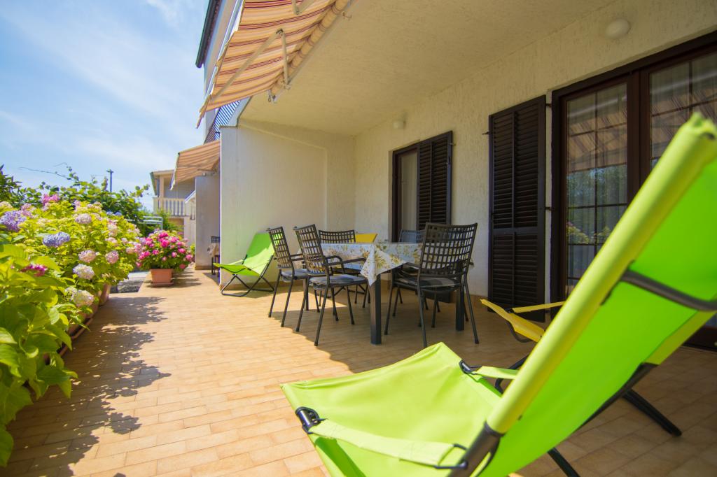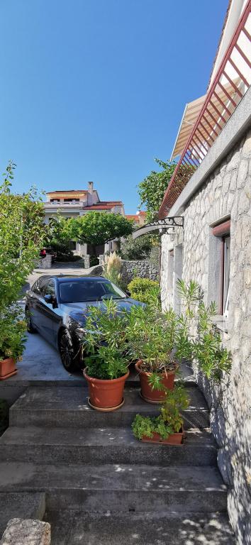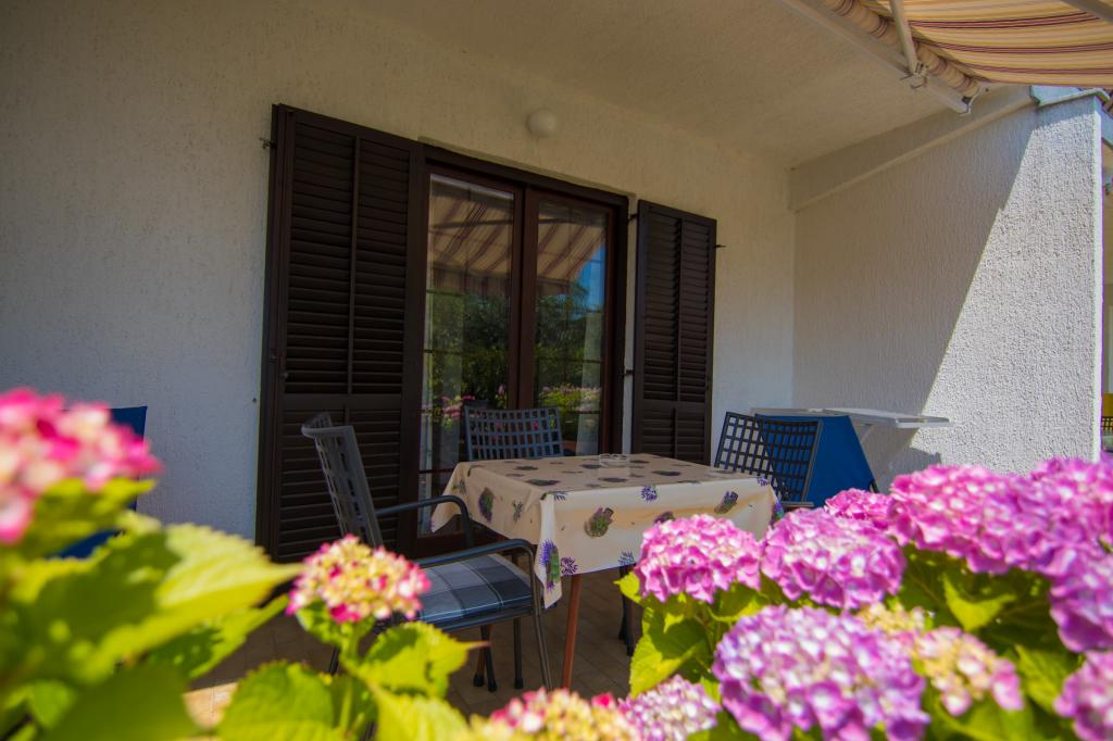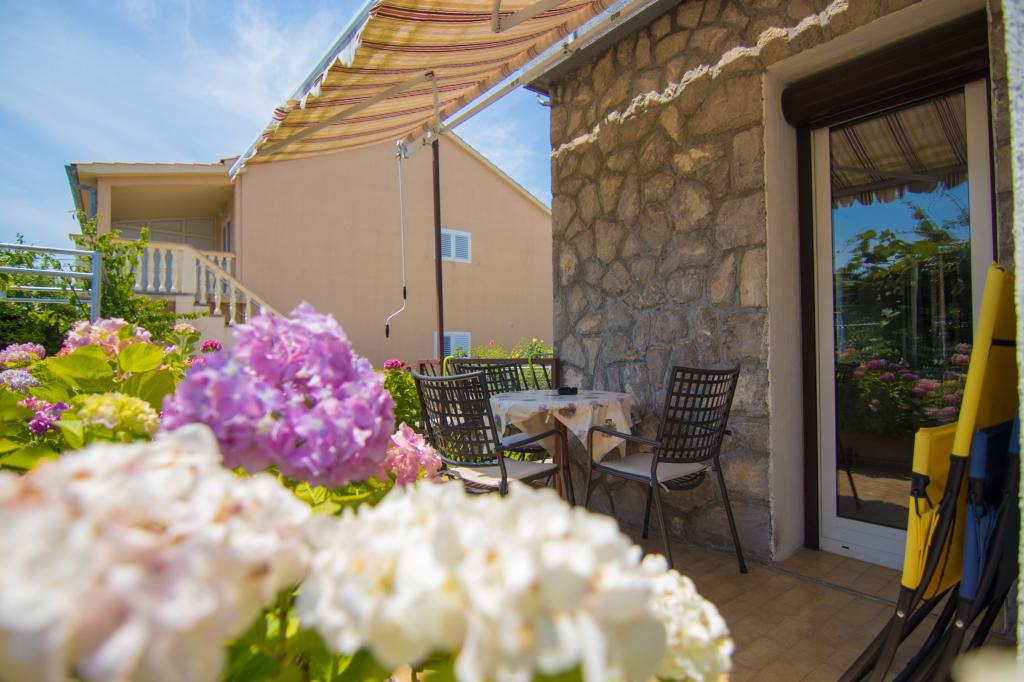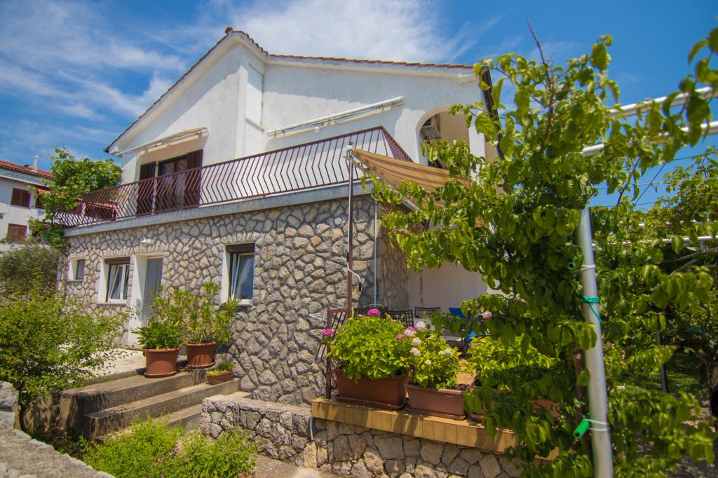 Naša kuća sa apartmanima, nalazi se u mirnom predjelu grada Krka. Apartmani su smješteni u prizemlju, jedan do drugoga. Suvremeno su opremljeni. Svaki ima svoju terasu, ograđenu cvijećem hortenzija (hydrangea). , sa pogledom na vrt. Parkiralište je u dvorištu, pokriveno sa sjenilom. Plaža PLAV udaljena je 2-3 minute hoda od naše kuće. Na katu kuće žive vlasnici.