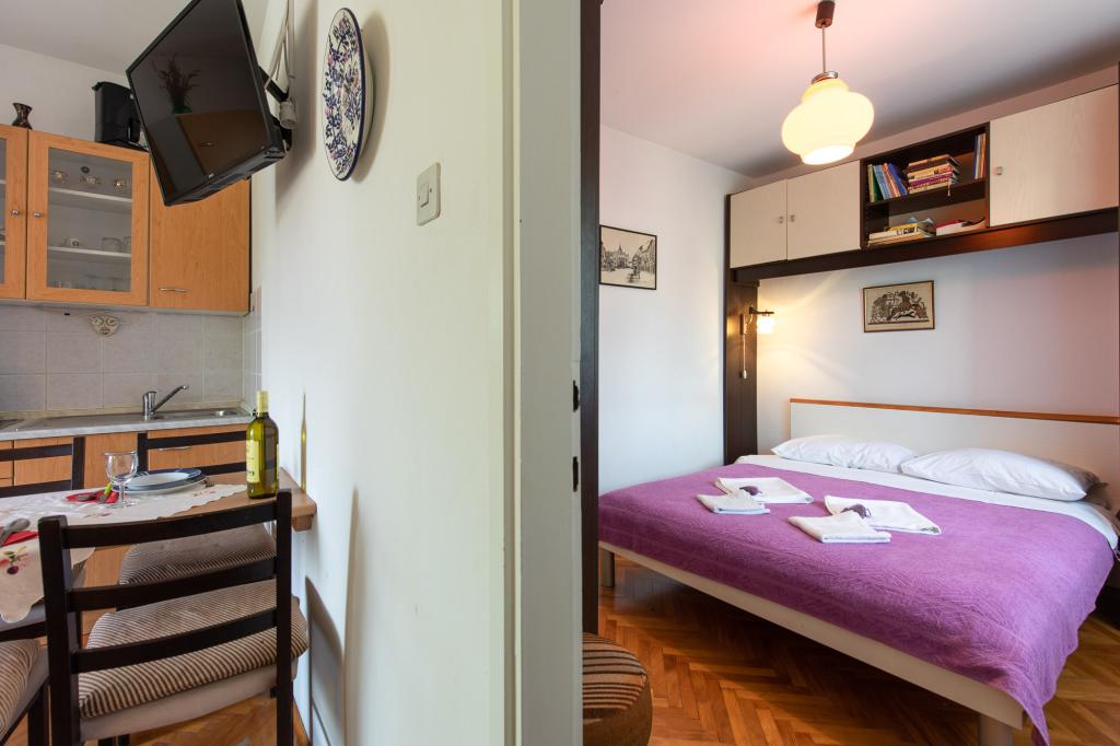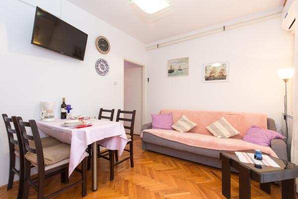 Dočekao nas je apartman pun paučine i prašine, nečistog stolnjaka te hrpom plijesni u frižideru koju smo morali sami čistiti (vlasnica je rekla da to nije ništa strašno i da u čemu mi živimo kad nas sve smeta?), nečista ladica u koju se odlažu zlice i vilice...kreveti su bili uredni, no jako škripe...namještaj je star, od kuhinje do vrata, što ne bi bio problem da je održavano ...previsoka cijena za lošu uslugu! Tamo se vise ne vraćamo niti preporučujemo drugima!