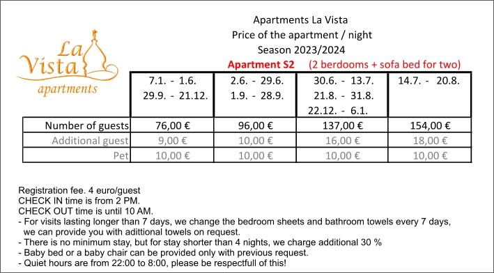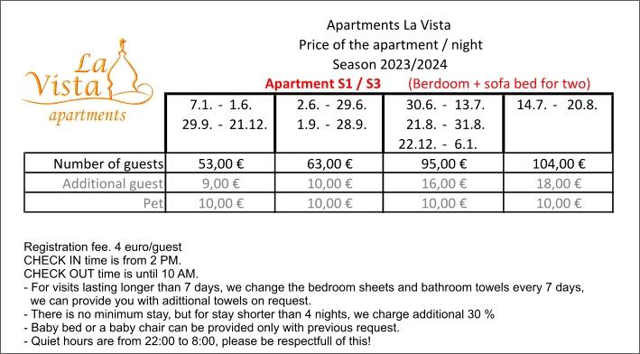 Pročitaj više Smještajne jediniceZa sve upite i rezervacije obratite nam se putem e-mail. Prijava gosta - 4, 00 EUR / po osobi. Ekološka pristojba - 0, 15 EUR osoba / dnevno, djeca do 12 godina starosti ne plaćaju ekološku pristojbu. Za boravak gostiju kraći od 4 noći cijena smještaja se uvećava za 30%. Završno čišćenje apartmana i boravišna (turistička) pristojba juključeni su u cijenu smještaja.