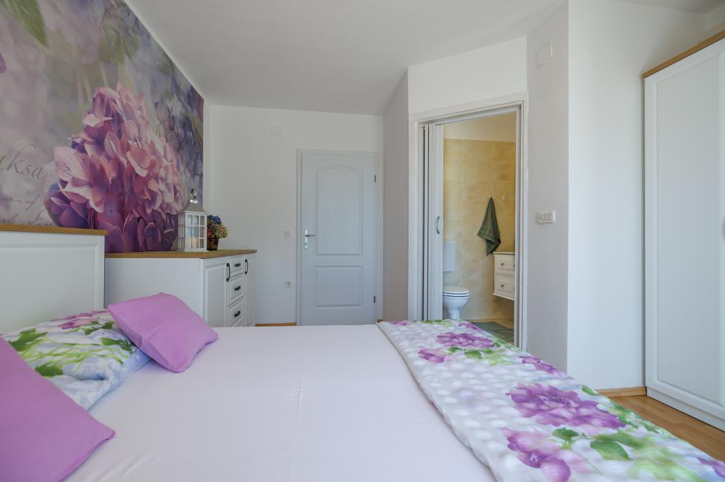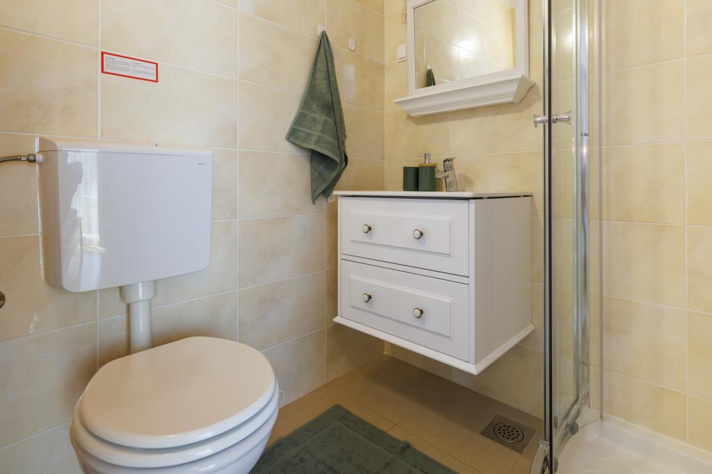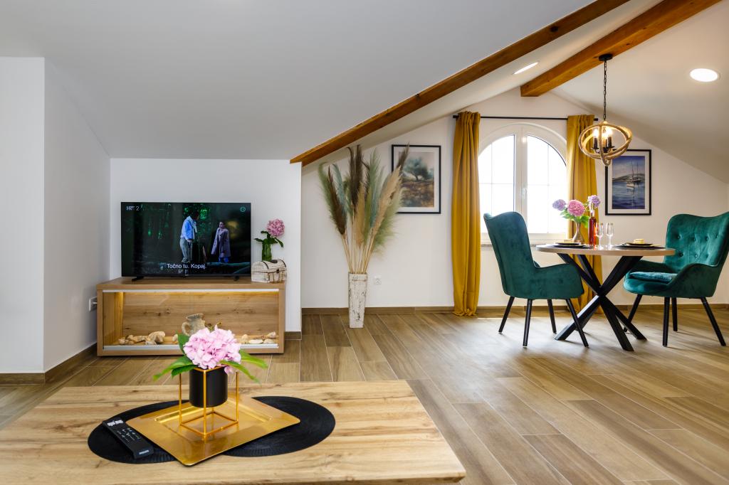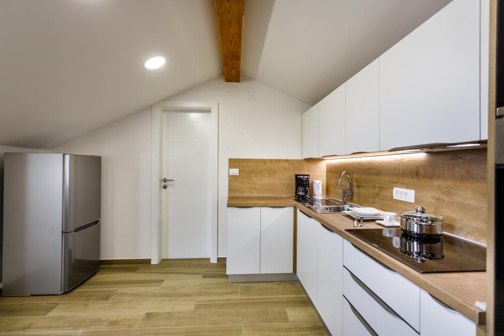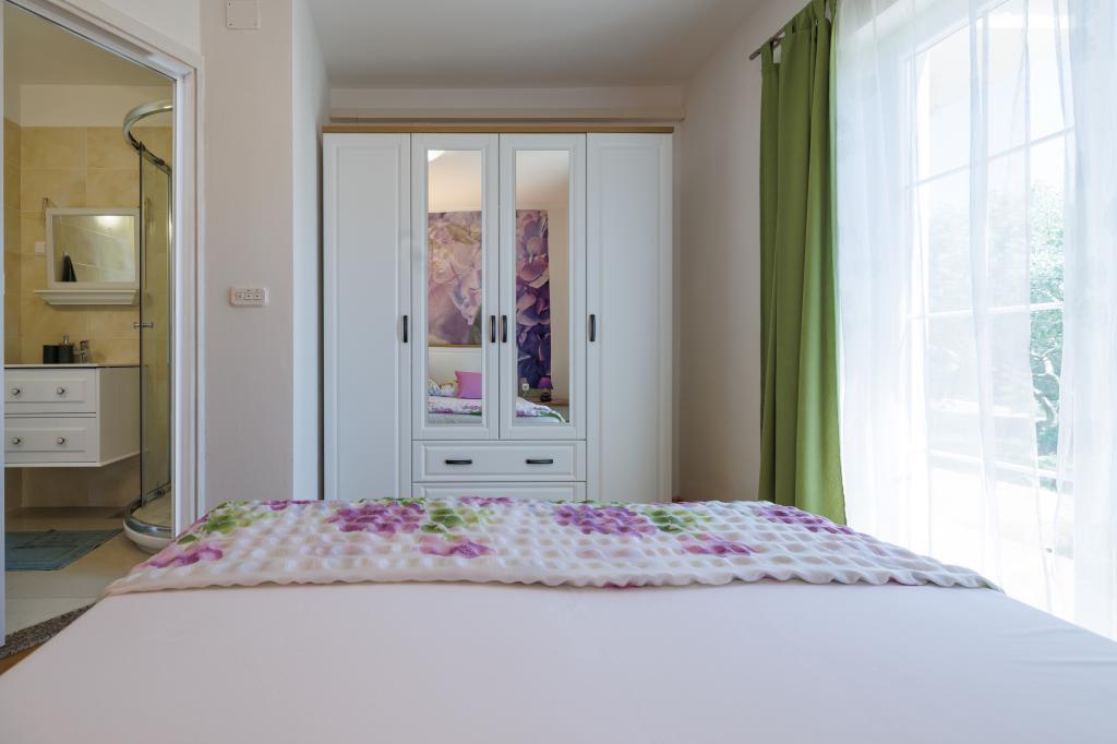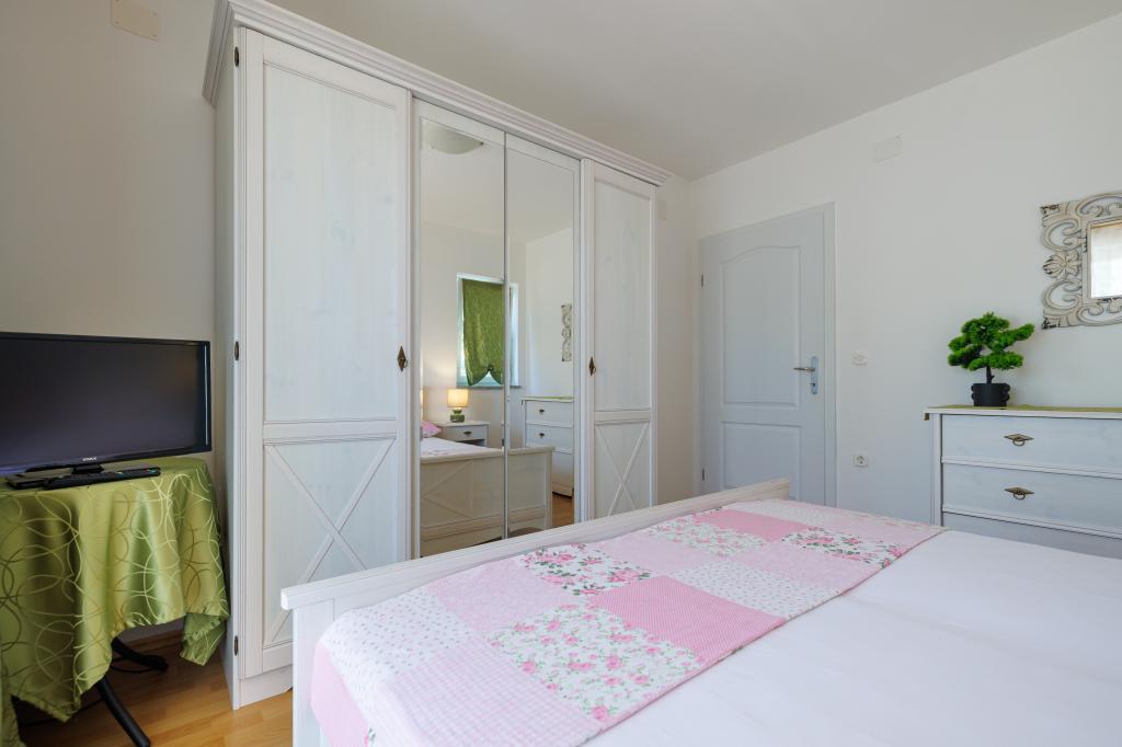 Novi moderni apartmani na mirnoj i atraktivnoj lokaciji Krka sa pogledom na more. Kuća se nalazi 300 metara do plaže i 700 metara do centra. Objekt ima vlastiti parking i vrt. Apartmani su moderno opremljeni i ugodni za boravak.