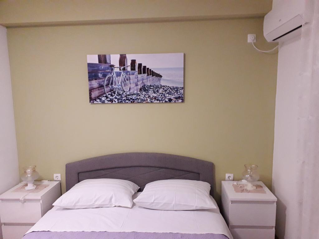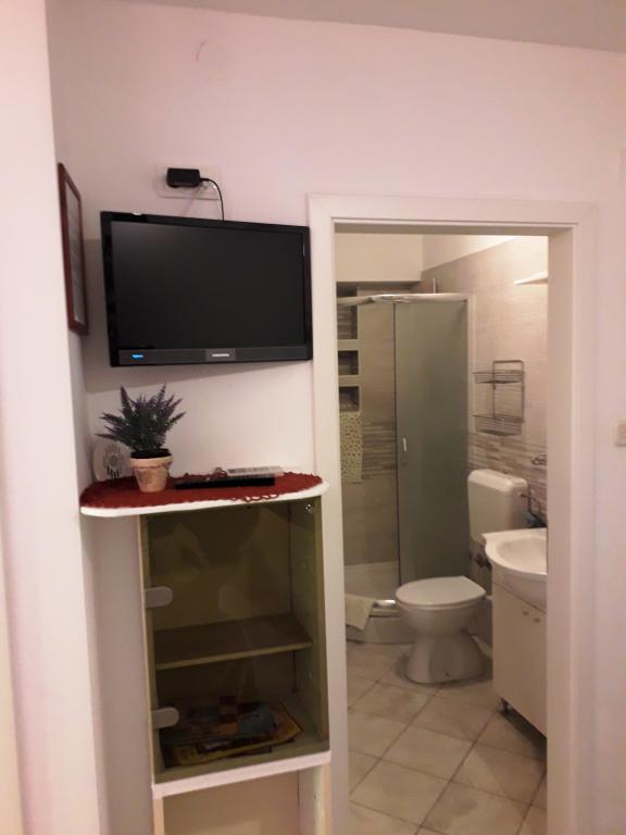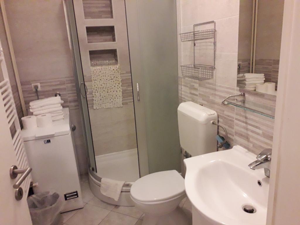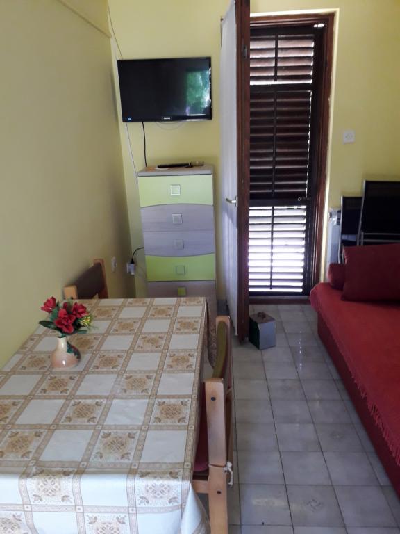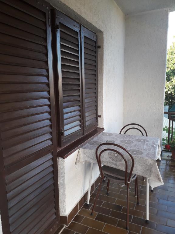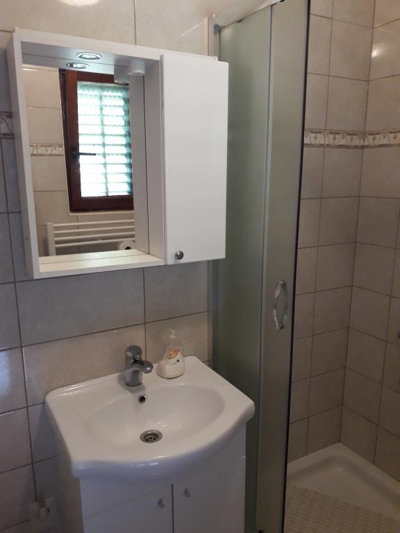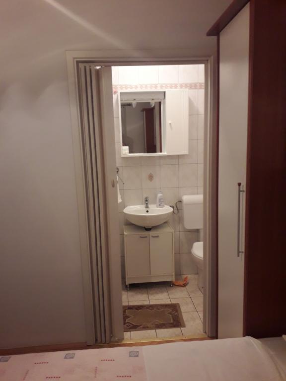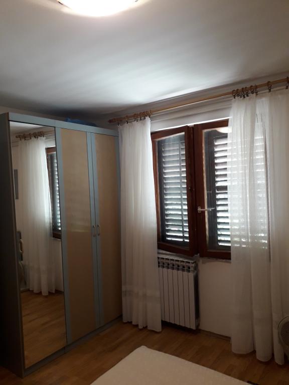 Soba sa vlastitom kupaonicom nalazi se na 1. katu kuće. Soba ima televizor, wifi, kupaonicu sa tuš kadom, hladnjak, bračni krevet pomoćni ležaj- prikladno za djecu, terasu sa garniturom za sjedenje, klima uređaj (doplata 5 €/dan)