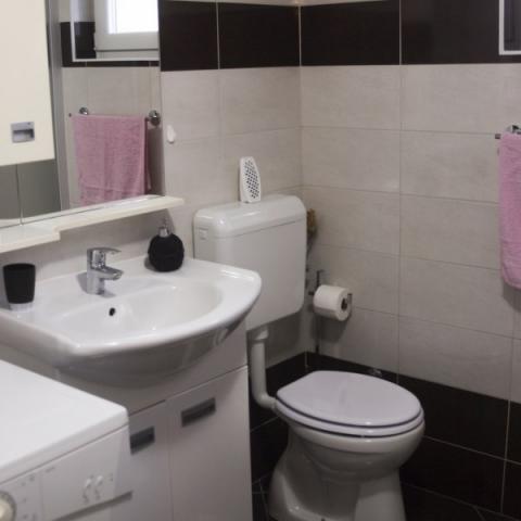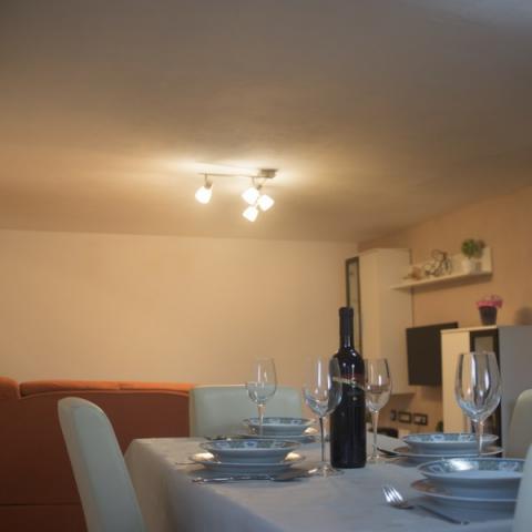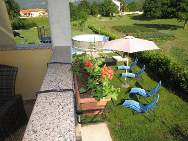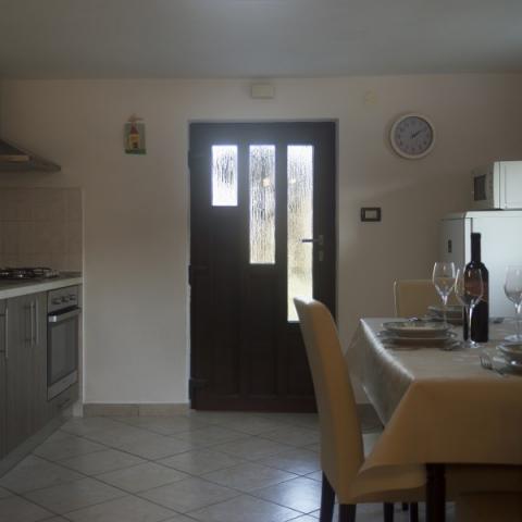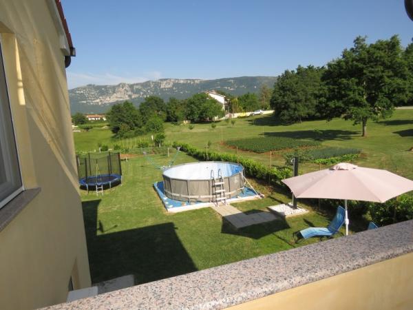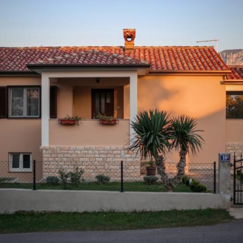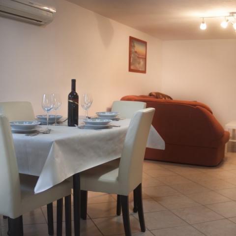 1-sobni apartman, 50m2 u prizemlju. Lijepo uređen:dnevni boravak/blagovaona s 1 kaučem(140x200cm), TV-om sa sat. prijemnikom(plosnati TV ekran), klima uređajem. Soba s krevetom(140x200 cm) i krevetom(90x200). WC s tušem. Otvorena kuhinja(4 ploče za kuhanje, pećnica, , mikrovalna pećnica, zamrzivač, el, aparat za kavu, kuhalo za vodu). Terasa s roštiljem( drveni stol 2 klupe. Pogled na bazen. Na raspolaganju:perilica rublja, sušilo za kosu. Vani se nalazi veliko ograđeno dvorište. U dvorištu se nalazi okrugli montažni bazen s tušem, ležaljkama i suncobranom. Dječje igralište s trampolinom, ljuljačkama, mrežom i opremom za badminton. U dvorištu se nalazi i roštilj s opremom. Kuća se sastoji od 1 apartmana za goste i 1 apartmana u kojem živimo mi. Kuća se nalazi u mjestu Kršan koje je udaljeno od Labina 12 km.