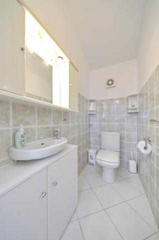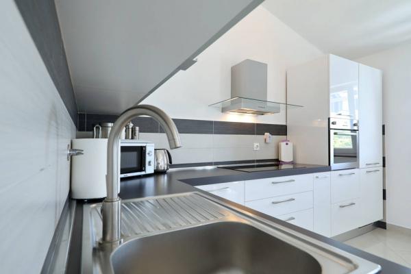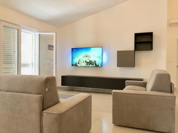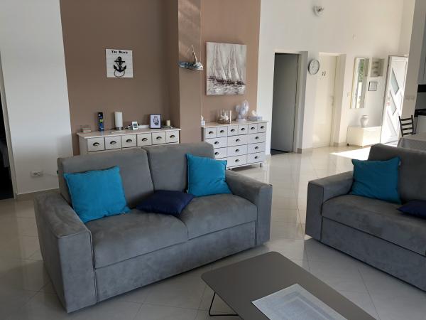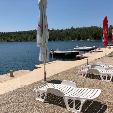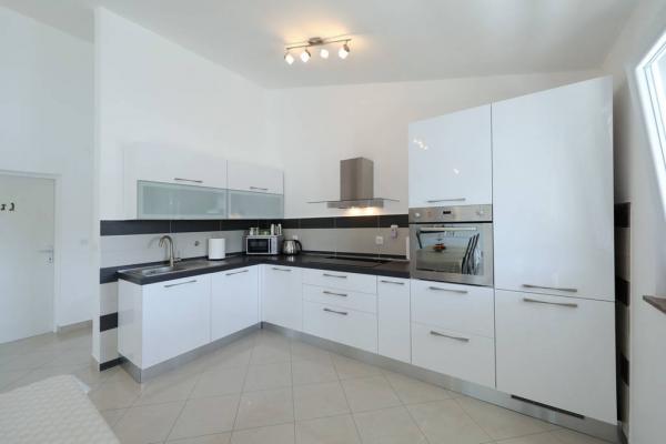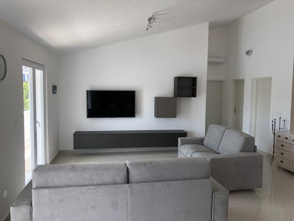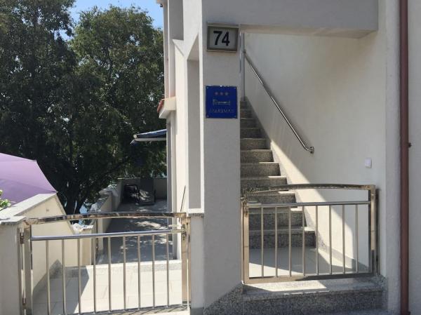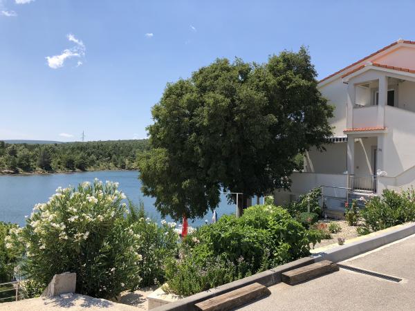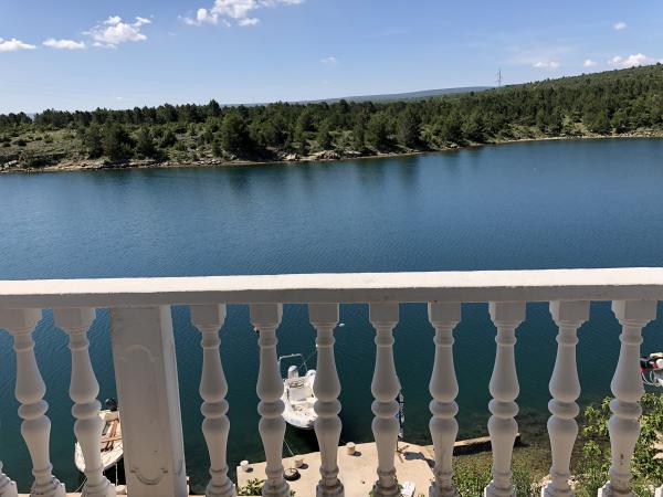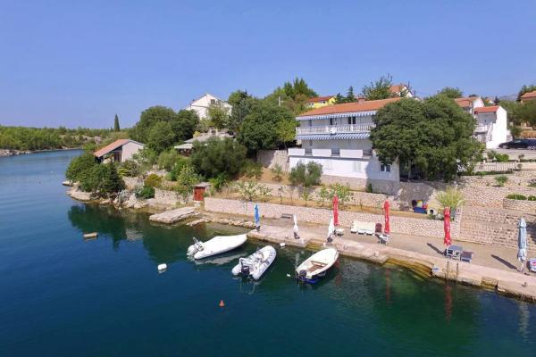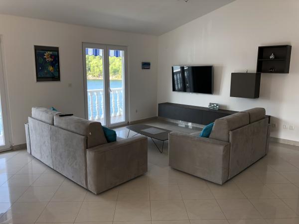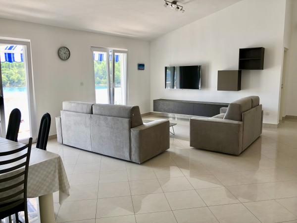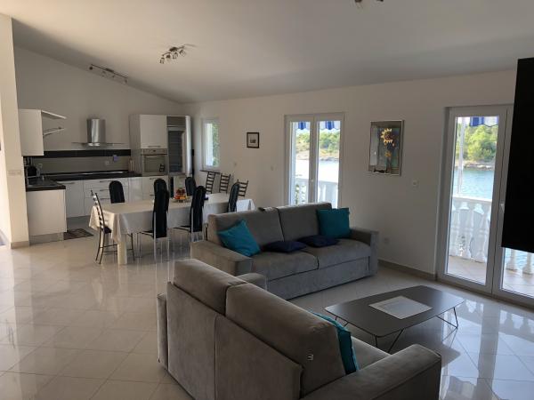 Kompletno opremljen apartman od 120m2 s pogledom na more na 1. katu, lijepo i udobno uređen: dnevni boravak / blagovaona 50m2, SAT TV, internet, klima uređaj, 4 spavaće sobe, kuhinja (4 ploče za kuhanje, pećnica, hladnjak), kupaonica s tušem i WC-om, WC, balkon, roštilj sa terasom... Apartman se nalazi u 1. redu tj. na samom moru iznad same plaže te ima vlastitu mogućnost priveza plovila... Vanjski tuš. Parking pored objekta. Trgovina 400 m, pješčana plaža 200 m, stjenovita plaža 20 m. Brojni izleti na ponudi...