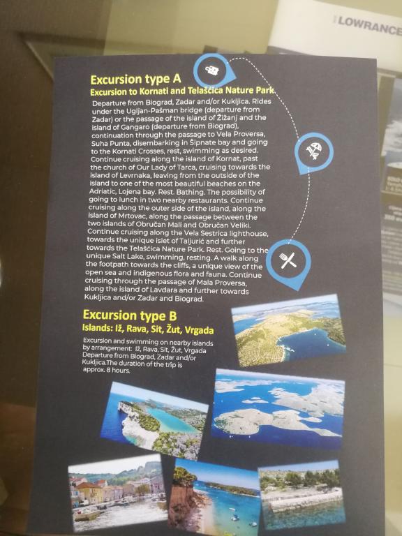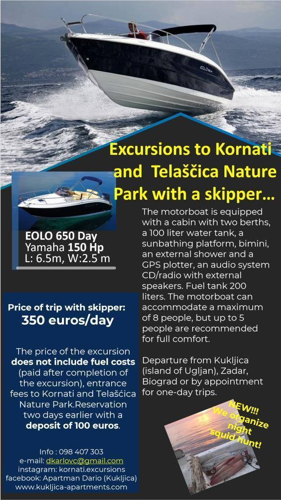 Domaćin nudi puno aktivnosti, dodatnih sadržaja i zabave i to izlete u obližnje uvale (pješčana Plaža Sabuša, Kostanj), otoke Zadarskog arhipelaga, Kornate, Park prirode Telašćica, sa stučnim skiperom i gliserom tip EOLO 650, motor Yamaha 150 za 6 osoba. U dogovoru sa skiperom organizira se poludnevni ili jednodnevni izlet (plivanje, ronjenje ili razgledavanje okolice). Ukoliko gosti žele komforan i brz prijevoz do Zadra za 10 minuta radi večernjeg izlaska ili šopinga i to je moguće uz najavu. Pored toga, gostima se nudi mogućnost organiziranja dnevnog i noćnog lova na lignje što je poseban užitak i neponovljiv doživljaj. Posebna atrakcija u lovu ribe ostima na tradicionalni dalmatinski način u noćnim satima pod umjetnim svijetlom neće vas ostaviti ravnodušnim. Dozvole za ribolov mogu se nabaviti u ribolovnom društvu Kukljica. Domaćin nudi i najam drvenog kanua i veslanje do obližnje predivne pješčane plaže Kostanj u obližnjoj uvali.