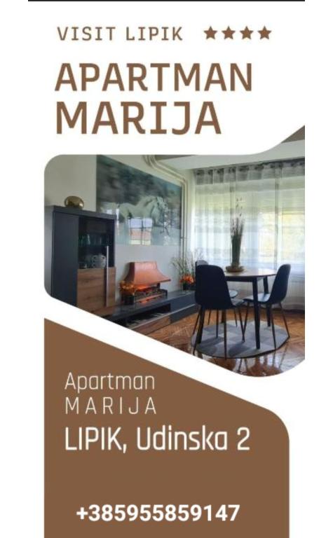 Apartman Marija Apartman se nalazi u neposrednoj blizini Toplica Lipik. Predviđen je za 2+1 osoba te je kategoriziran sa 4 zvjezdice. Apartman se sastoji od: kuhinje, kupaonice, dnevnog boravka te spavaće sobe. Kako je vidljivo na slikama apartman je u cijelosti opremljen npr. walk in tušem, box spring krevetima, rukohvat do ulaznih vrata te je prilagođen osobama sa fizičkim poteškoćama... Ujedno ispred samog smještaja se nalazi besplatno parking mjesto.