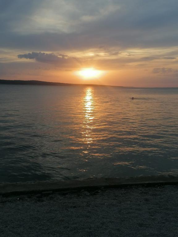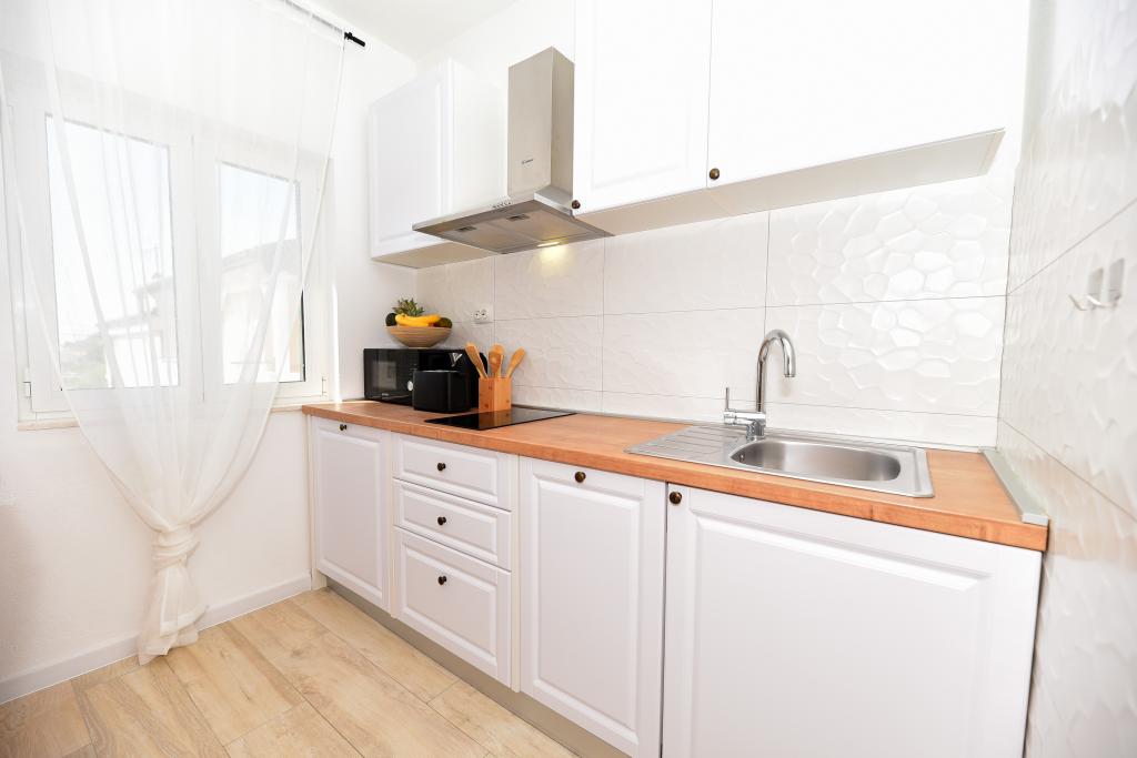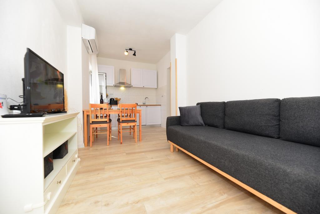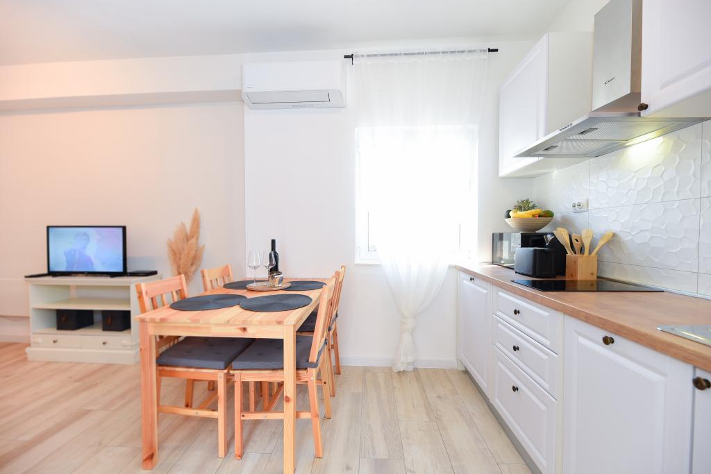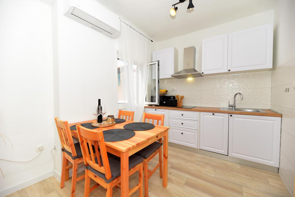 Moderno namjesten apartman u atraktivnoj kuci u nizu sa garazom udaljen od mora i plaze 50 m. Idealan za miran obiteljski odmor , kompletno opremljen sa terasom , garzom i prostoriom s ves masinom .