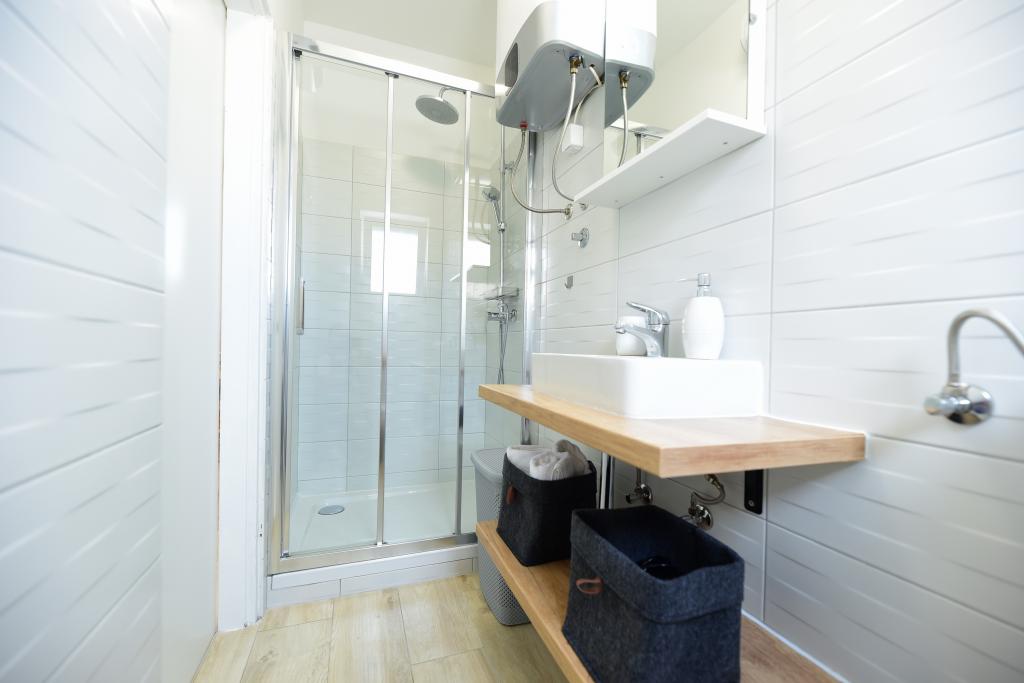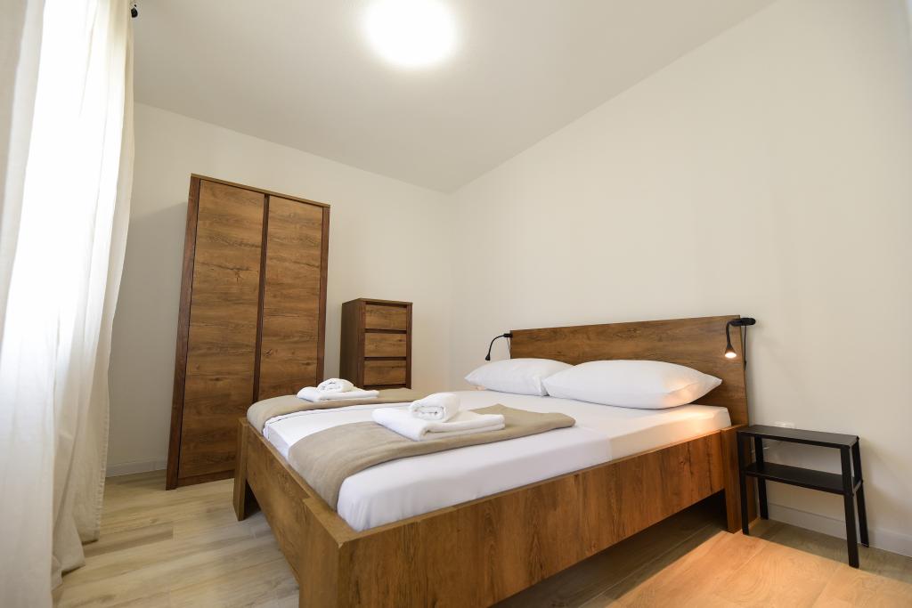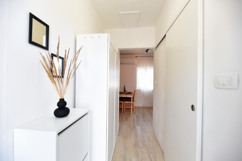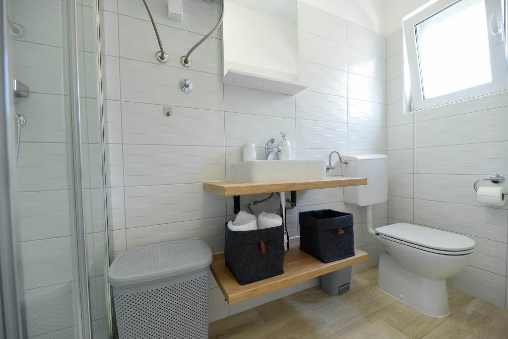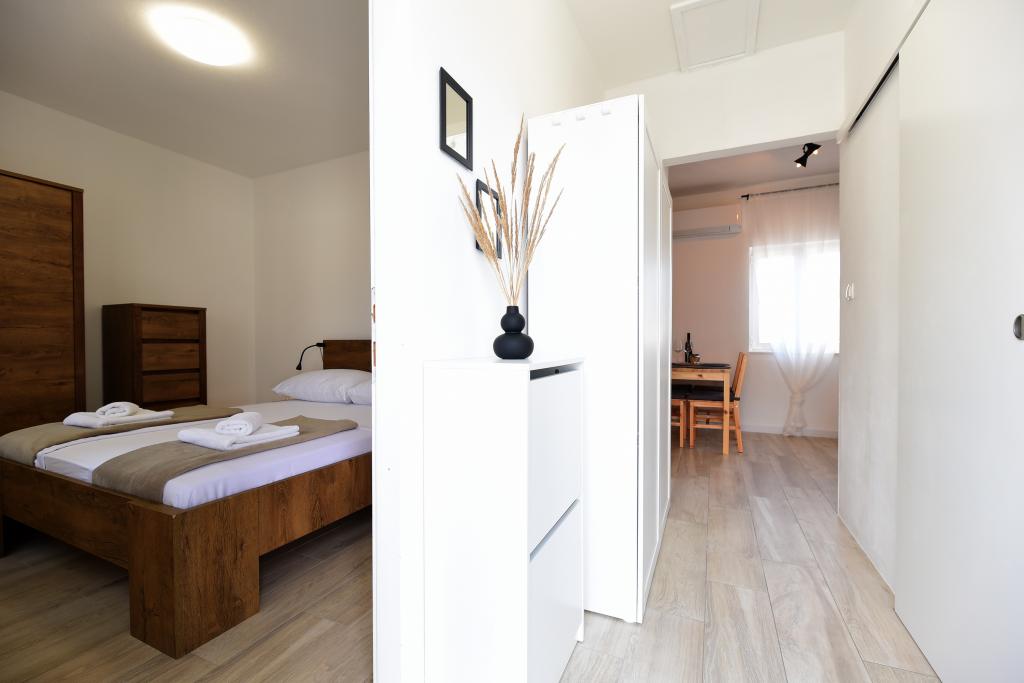Moderno namjesten apartman u atraktivnoj kuci u nizu sa garazom udaljen od mora i plaze 50 m. Idealan za miran obiteljski odmor , kompletno opremljen sa terasom , garzom i prostoriom s ves masinom .