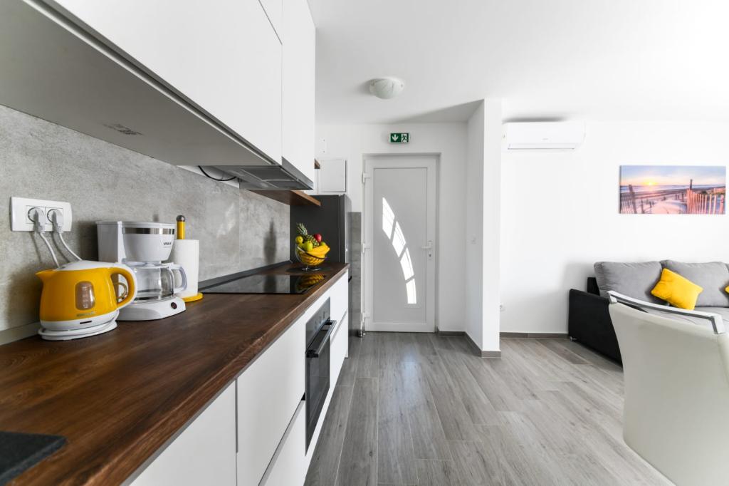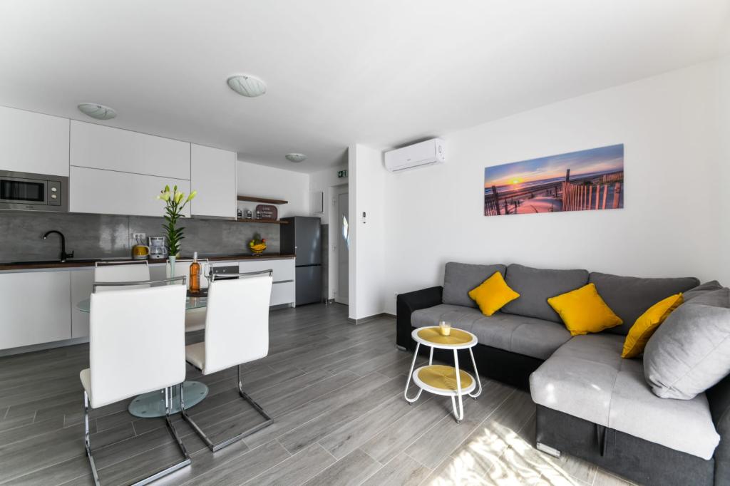Jednosobni apartman 2+2 izgrađen 2020 god. Moderan, kompletno opremljeni apartman u mirnom dijelu mjesta, osigurava mir i tišinu. Udaljen je od mora 300 m, od restorana i kafića 700 m i dućana 800 m. Dostupan grill, terasa i balkon s pogledom na more. Osiguran parking. Za djecu osiguran mobilni krevetić i hranilica. Autom lako dostupni nacionalni park Paklenica, otok Pag, Nin, Vrsi, Zadar, 24 km od Zračne luke Zemunik.