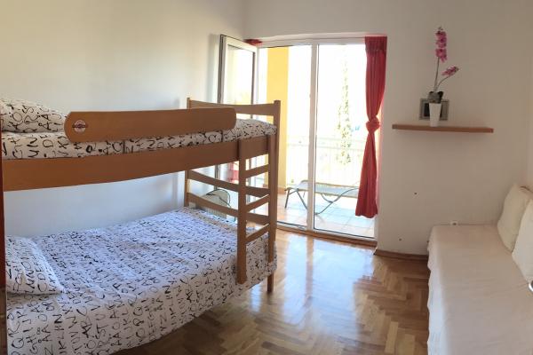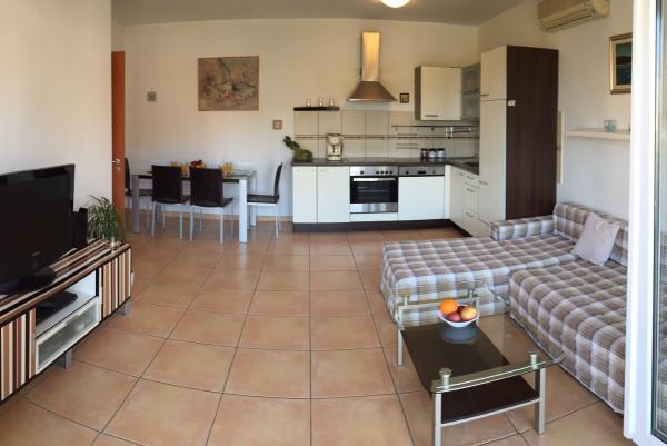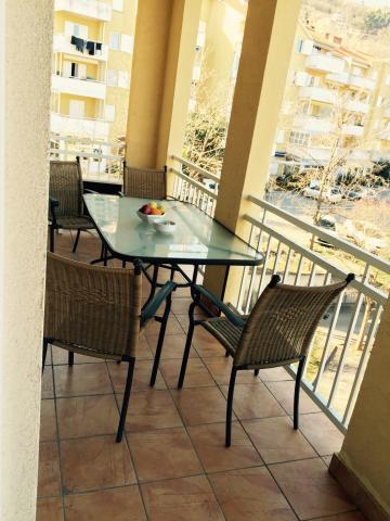 Apartman sastoji se od velikog dnevnog boravka, kroz cijeli dnevni boravak je staklena stijena koja je povezana s lođom s pogledom na Opatiju i Učku, kuhinjom koja je opremljena sa aparatom za kavu, mikrovalnom pećnicom, perilicom posuđa, tosterom, hladnjak i zamrzivač, te blagovaonicom sa stolom za 6 osoba. Dnevni boravak ima klima uređaja, LCD TV, kutnu garnituru na razvlačenje na kojoj komotno mogu spavati 2 osobe. Apartman ima 2 spavaće sobe od koje je jedna sa bračnim krevetom, a druga ima krevet na kat i kauč na rasklapanje. Apartman ima 2 kupaonice od kojih je jedna s tuš kabinom i druga s kadom i strojem za pranje rublja. Ispred apartmana imate osigurano parkirno mjesto broj 21 i vrata na daljinski. U apartmanu smo vam pripremili toaletni papir, šampon, sušilo za kosu, proizvodi za čišćenje i ručnike U kuhinji imate sve začine, kavu, ulje, ocat i pribor za kuhanje i serviranje.