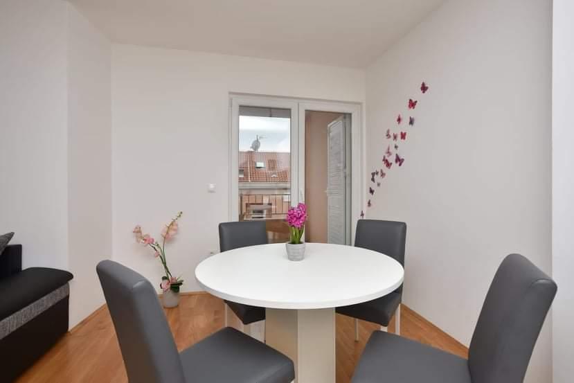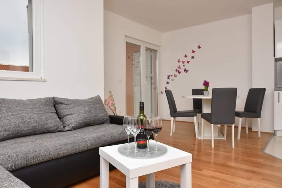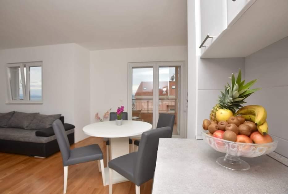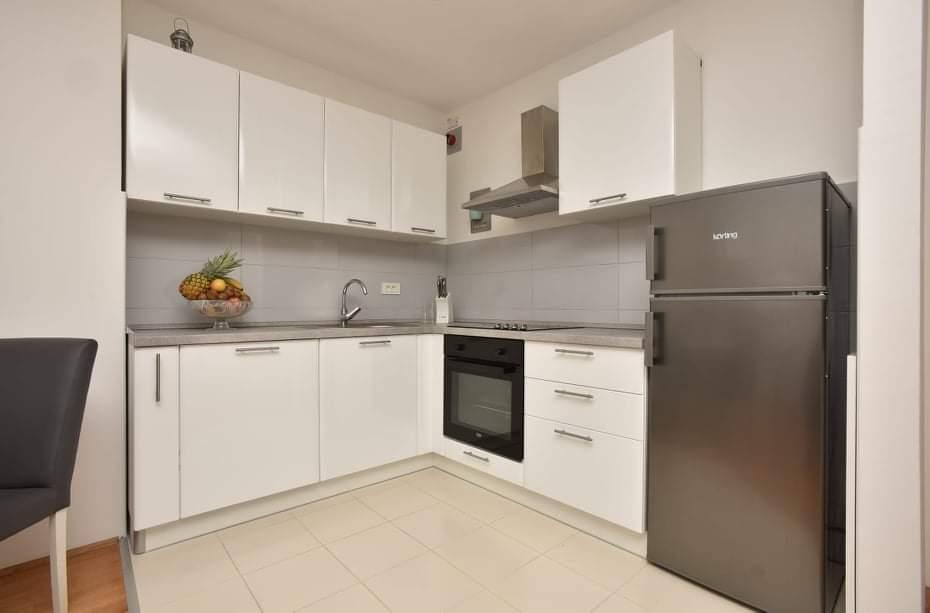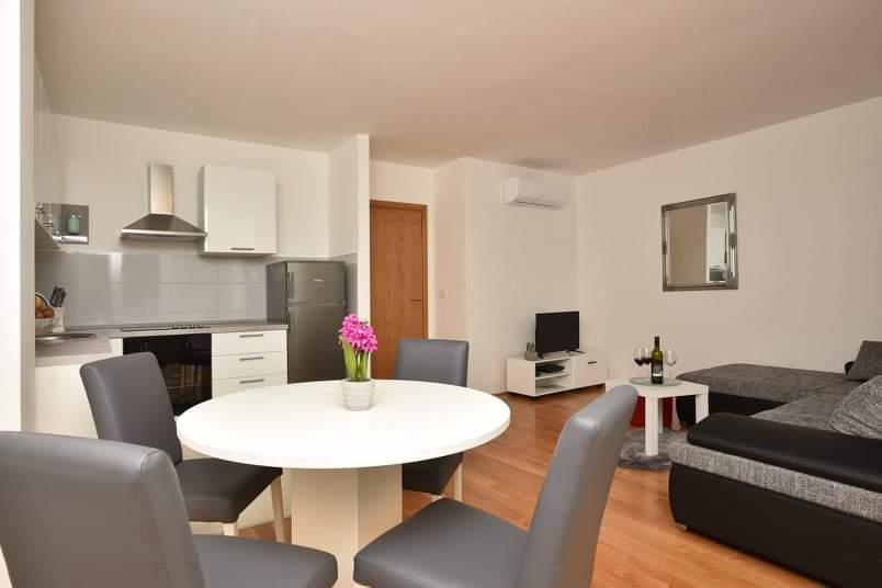 Apartman s pogledom na more, kompletno opremljen! Šarmantan i moderan apartman nalazi se na mirnoj poziciji,udaljenosti svega 500 m od mora i glavne gradske plaže. Nalazi se na drugom katu stambene zgrade. U blizini zgrade se nalazi kafić,trgovina,ljekarna. Apartman je pogodan za 4 osobe. Ima 1 spavaću sobu s 1 bračnim krevetom i kaučem na razvlačenje u dnevnom boravku. U cijenu apartmana je uključeno: vlastito parkirno mjesto, neograničeni internet, klima, TV, ručnici, posteljina, kuhinja sa svim potrebnim sadržajima...