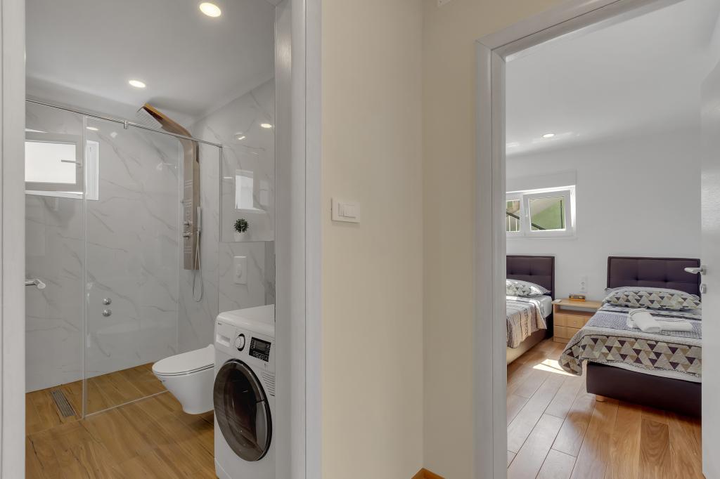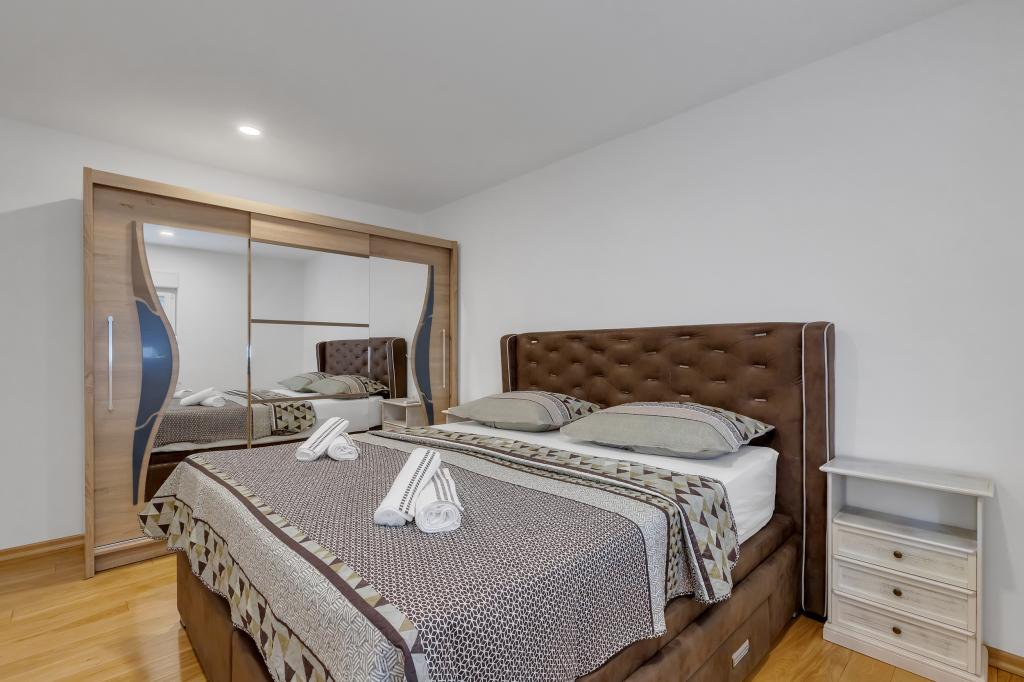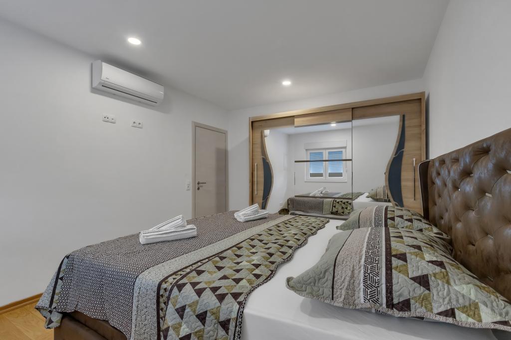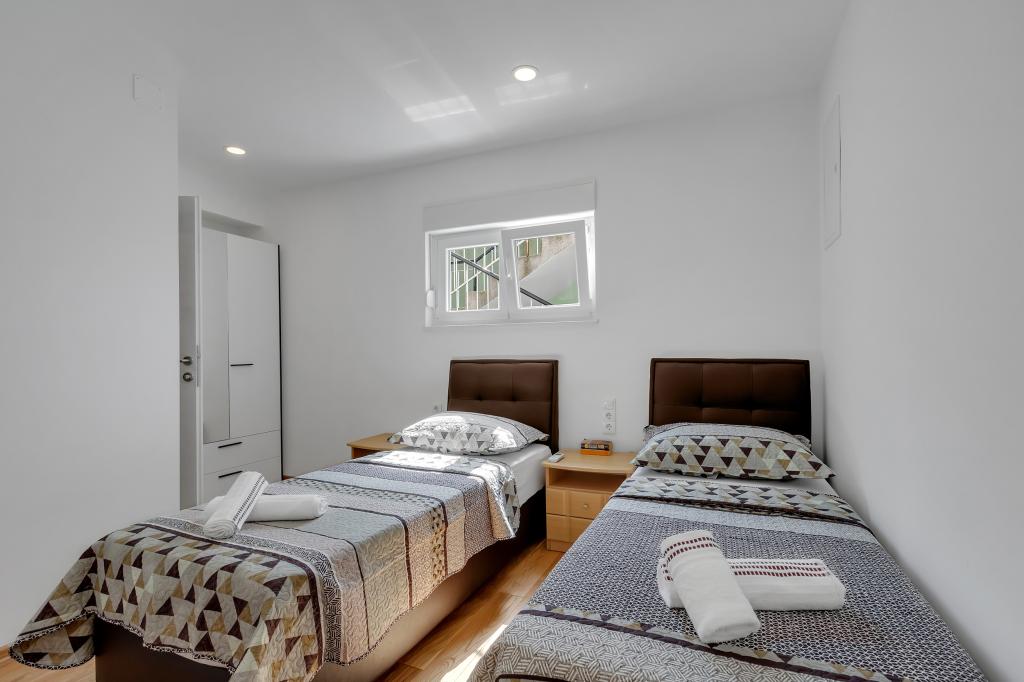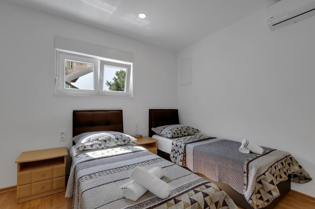 Potpuno opremljeni apartman/stan s dvije sobe ( bracna , krevet 180x200 , i druga s 2x kreveta odvojena koja se po zelji mogu spojiti ) , 2 kupatila , velikim dnevnim boravkom s kuhinjom ( zajedno 40m2 ) Stan ima sve potrebno za duzi i komotni smjestaj i nalazi se u centru makarske