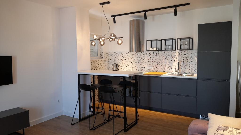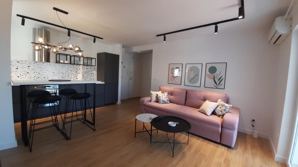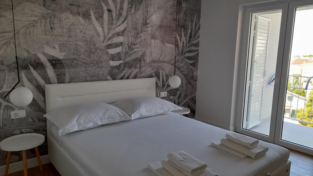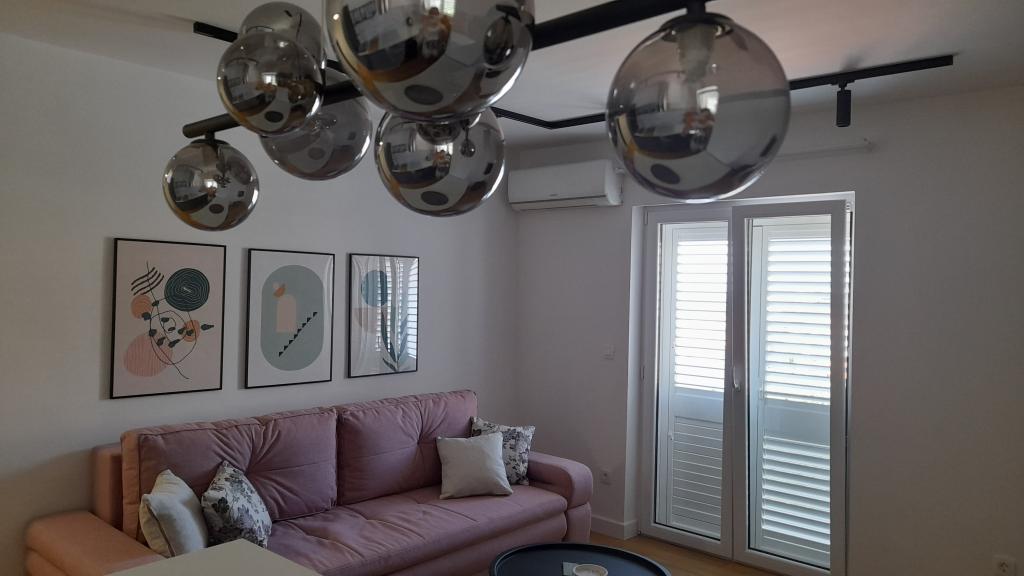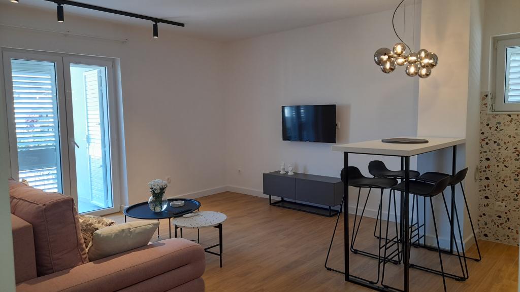 Moderan apartman na trećem katu zgrade s terasom sa pogledom na more i planinu Biokovo. Stan se sastoji od kuhinje, dnevnog boravk s blagavaonicom, spavaće sobe i kupaonce.