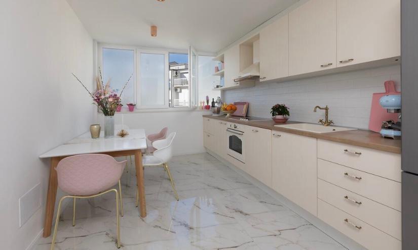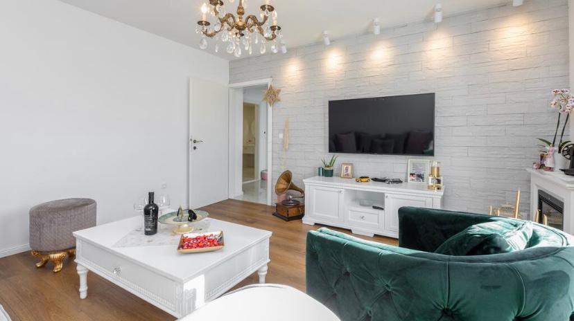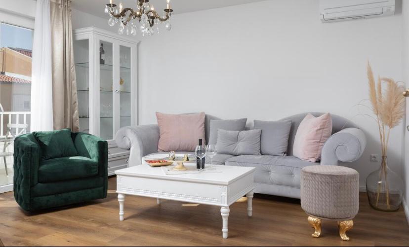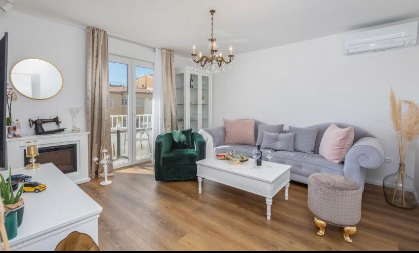 Kompletno novouređen apartman u stambenoj zgradi. Nalazi se na drugom katu, 3 minute hoda do plaže i 10 minuta hoda do centra s parkingom ispred zgrade.